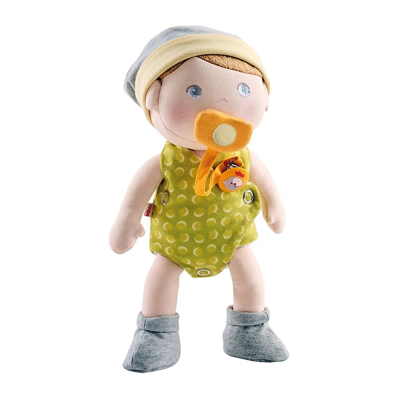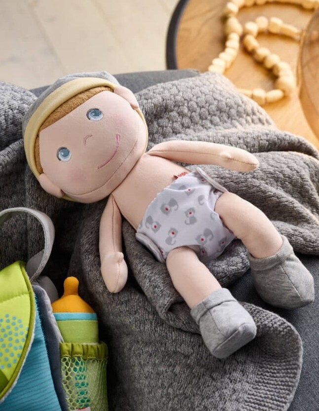 Die goldige Babypuppe von HABA lässt sich wie ein richtiges Baby knuddeln und umsorgen. Mit dem umfangreichen Zubehör gestalten Kinder das Puppen-Rollenspiel realitätsnah und abwechslungsreich. Im Handumdrehen ist die Kuschelpuppe umgezogen. Body und Stoffwind...