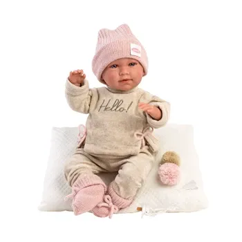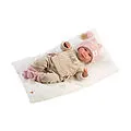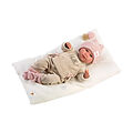 42cm grosse Babypuppe mit blauen Augen, und weichem Körper. Kopf, Arme und Beine sind aus Vinyl. Sie trägt ein flauschiges Outfit mit Mütze und Söckchen in altrosa. Inklusive Schnuller und Schnullerkette.