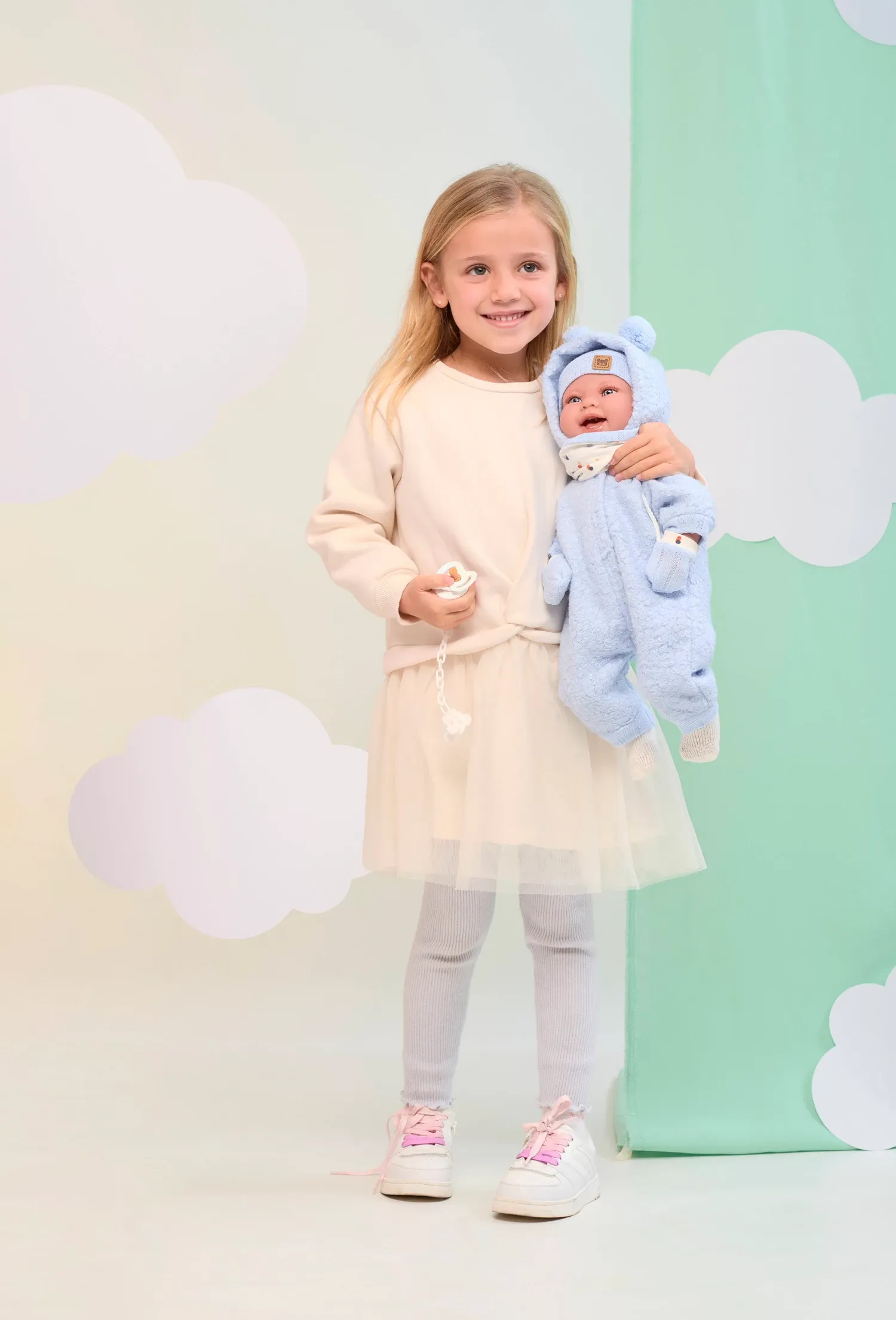 44 cm grosse Babypuppe mit blauen Augen, und weichem Körper. Kopf, Arme und Beine sind aus Vinyl. Talo trägt einen winterlichen blauen Overall inklusive Kappe, Schal und Handschuhe. Inklusive Schnuller und Schnullerkette.