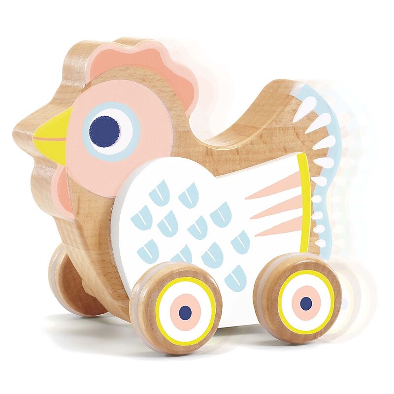 Eine kleine Henne als Schiebespielzeug, die beim Rollen eine süsse Melodie spielt: Twinkle Twinkle little star. 12 x 11 x 9 cm. Geeignet ab 10 Monaten.