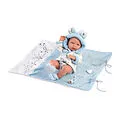 40cm grosse Baby Badepuppe mit blauen Augen und Geschlechtsmerkmal (Junge), komplett aus zartem Vinyl. Trägt einen hellblauen Bademantel inklusive Decke, Schnuller, und Schnullerkette.
