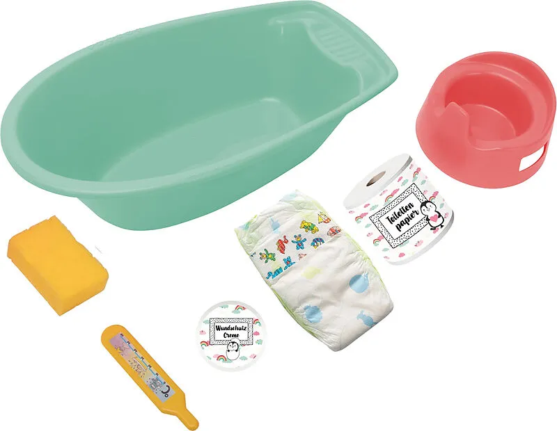 Badewanne aus hochwertigem Material und nützliche Accessoires: ein Schwämmchen, eine Bade-Pinguin, ein Badethermometer, ein Töpfchen, eine Windel, Toilettenpapier und eine Creme-Dose.