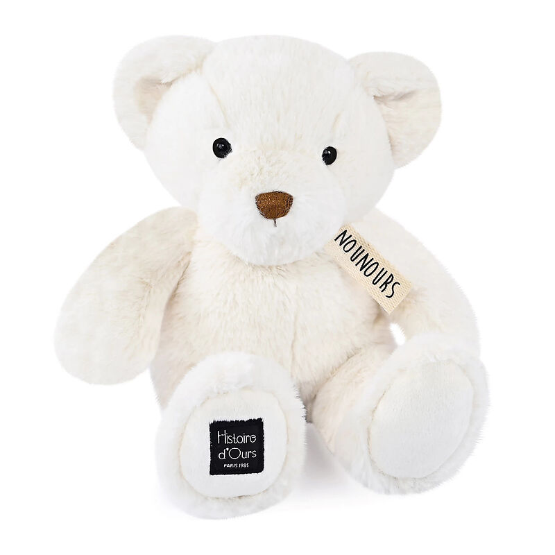 Der Bär Nounours in weiss kuschelt gerne und entdeckt mir dir die grosse weite Welt. Maschinenwäsche bei 30° Grad. Grösse: 28cm.