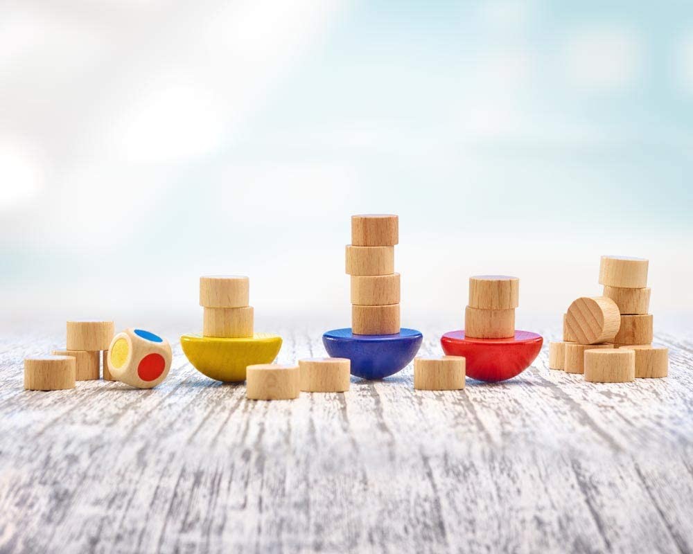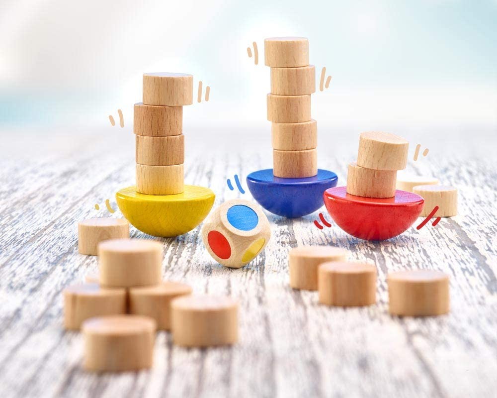 Der Farbwürfel bestimmt, auf welche Halbkugel jeweils ein Stein gesetzt werden muss. Mit der Zeit entstehen drei wackelige Türmchen. Je höher, desto spannender wird das Spiel. Hoffentlich stürzt kein Türmchen ein! Achtung, Einsturzgefahr! Wer baut auf den wack...