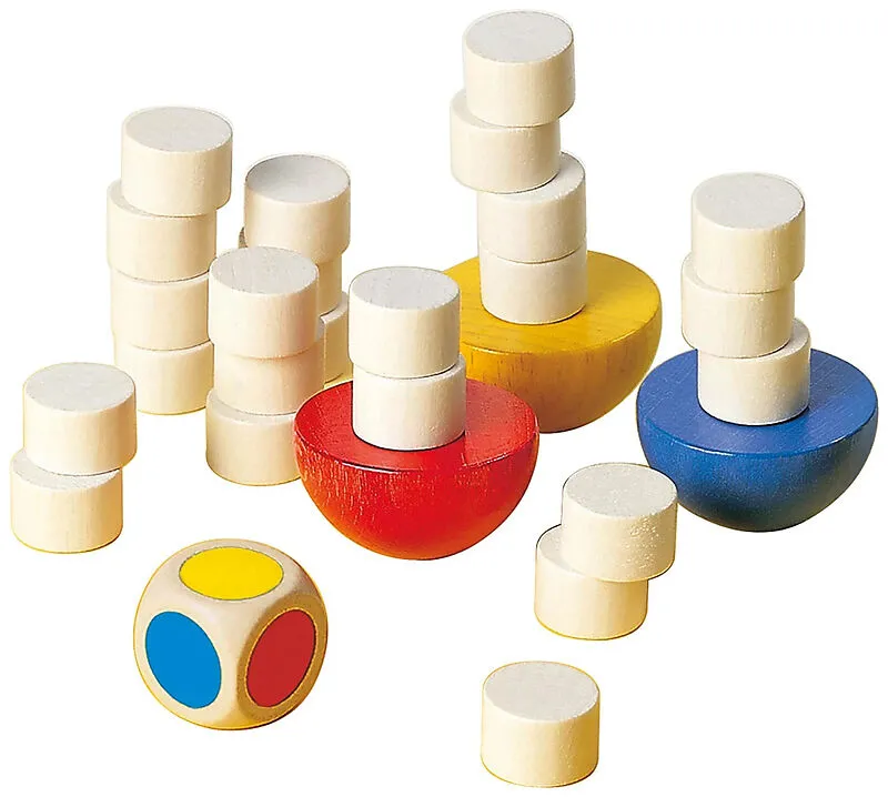 Der Farbwürfel bestimmt, auf welche Halbkugel jeweils ein Stein gesetzt werden muss. Mit der Zeit entstehen drei wackelige Türmchen. Je höher, desto spannender wird das Spiel. Hoffentlich stürzt kein Türmchen ein! Achtung, Einsturzgefahr! Wer baut auf den wack...