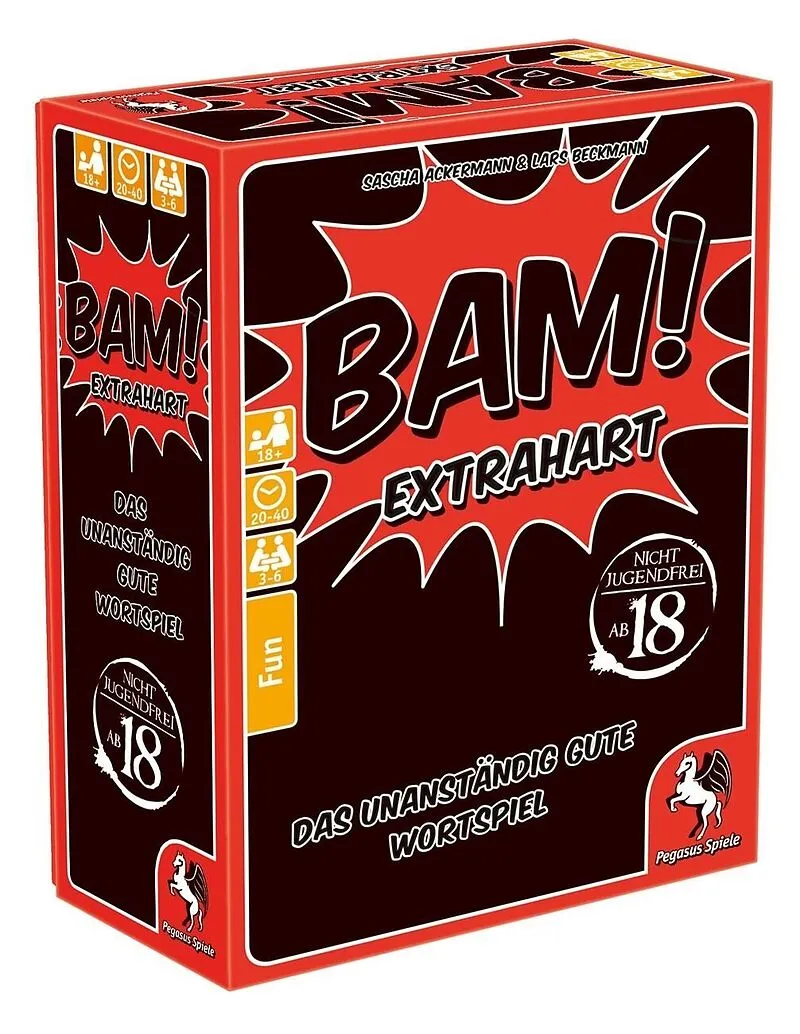BAM! ist das freche Partyspiel, bei dem Schlag auf Schlag derbe bis geniale Wortspiele entstehen. Das beliebte Spielprinzip erschließt mit BAM! Extrahart neue Dimensionen der Unanständigkeit. Spieler ab 18 Jahren können hier als Grenzgänger des guten Geschmack...