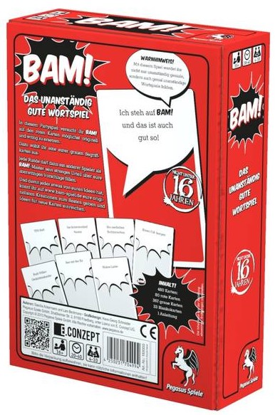 BAM! ist das unanständig geniale Partyspiel, das garantiert für jede Menge Spielspaß sorgt! Hier gleicht keine Runde der anderen! In diesem einfach witzigen Partyspiel besteht die Aufgabe jedes Spielers darin, die Lückentexte mit Begriffen zu füllen und mit de...