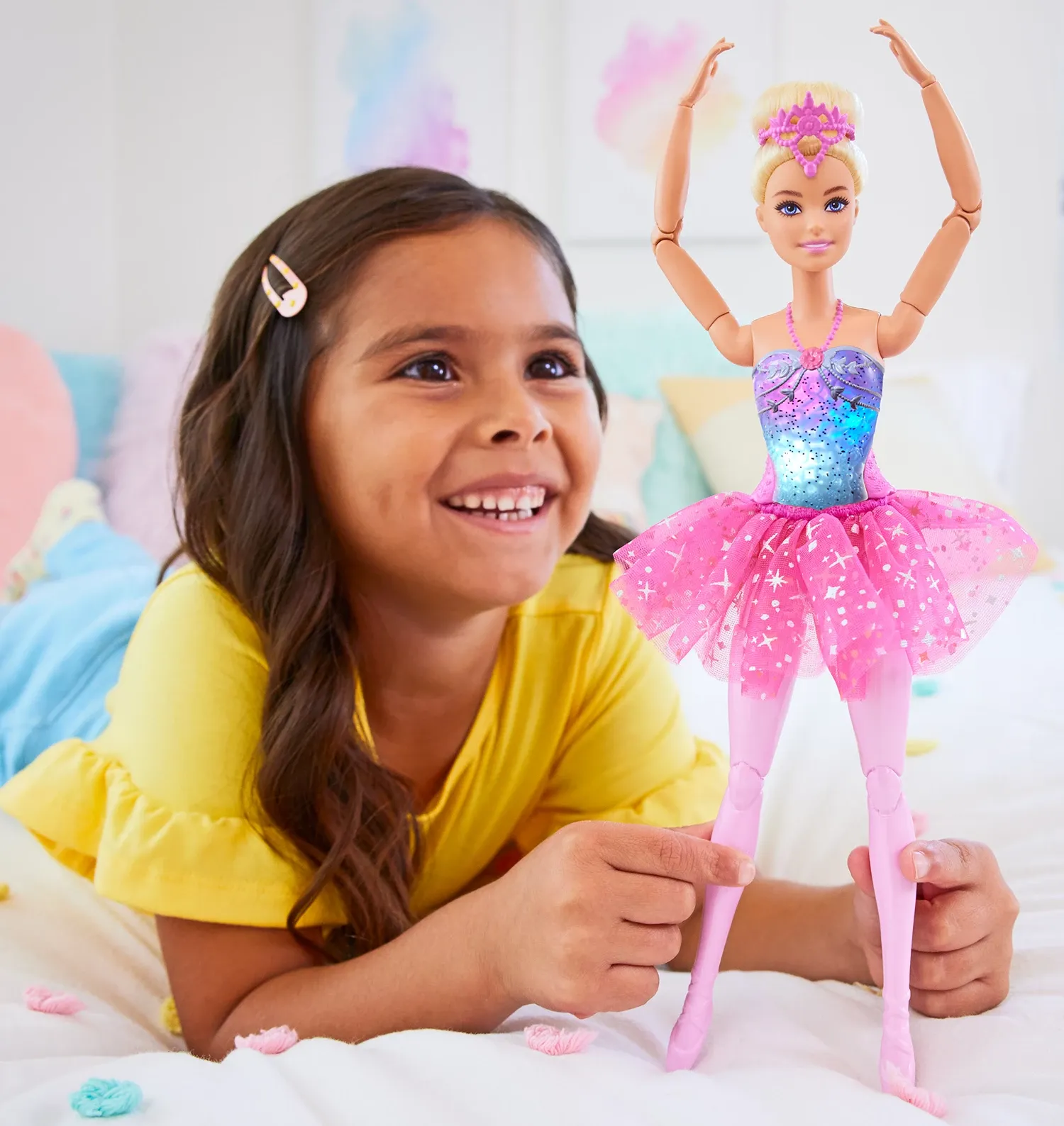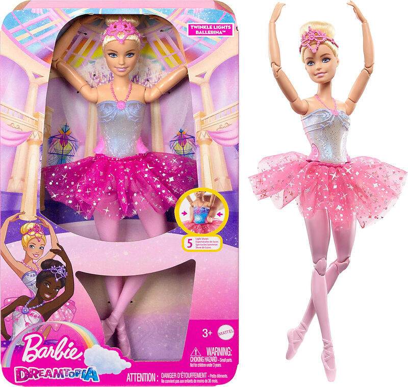 Mattel HLC25 Feature Ballerina 1 Die Barbie-Puppe leuchtet, wenn sie tanzt! Diese hübschen Ballerinas verfügen über magische Lichter, die ein magisches Spielerlebnis bieten. Ihre beweglichen Körper und glänzenden Outfits sorgen für noch mehr Spielspaß. Die Pup...