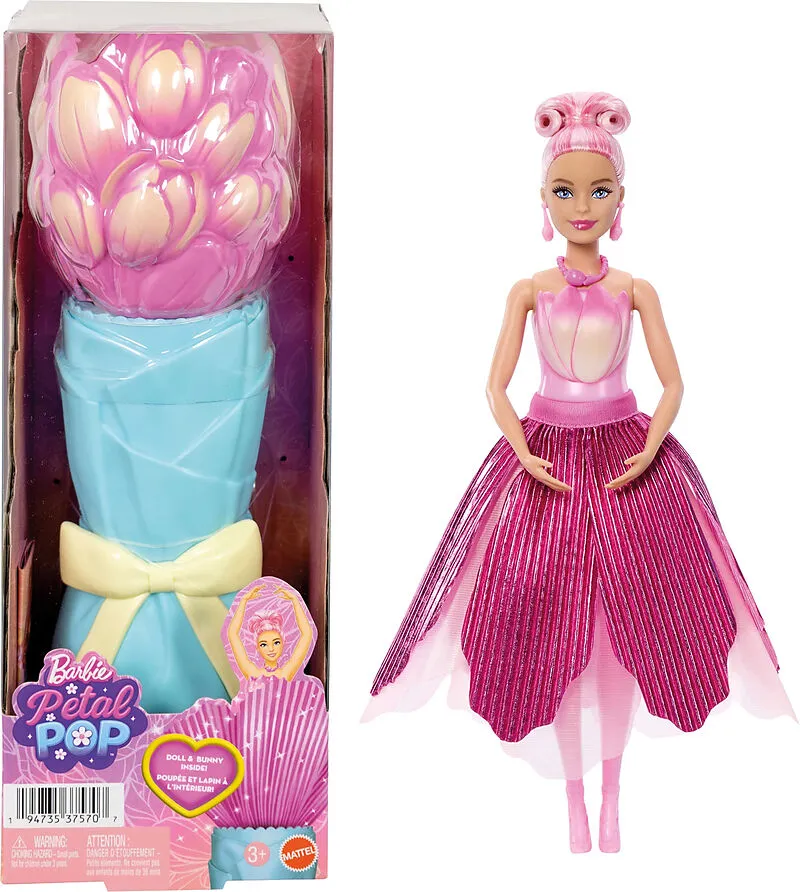 Barbie Flower Surprise Puppe - pinke Tulpe Jede duftende Barbie-Puppe riecht so frisch und süss wie eine Blume! Ihre farbenfrohen Kleider haben ein dekoratives Blumenoberteil und einen Rock aus Blütenblättern. Jede duftende Puppe kommt mit einem Überraschungsa...