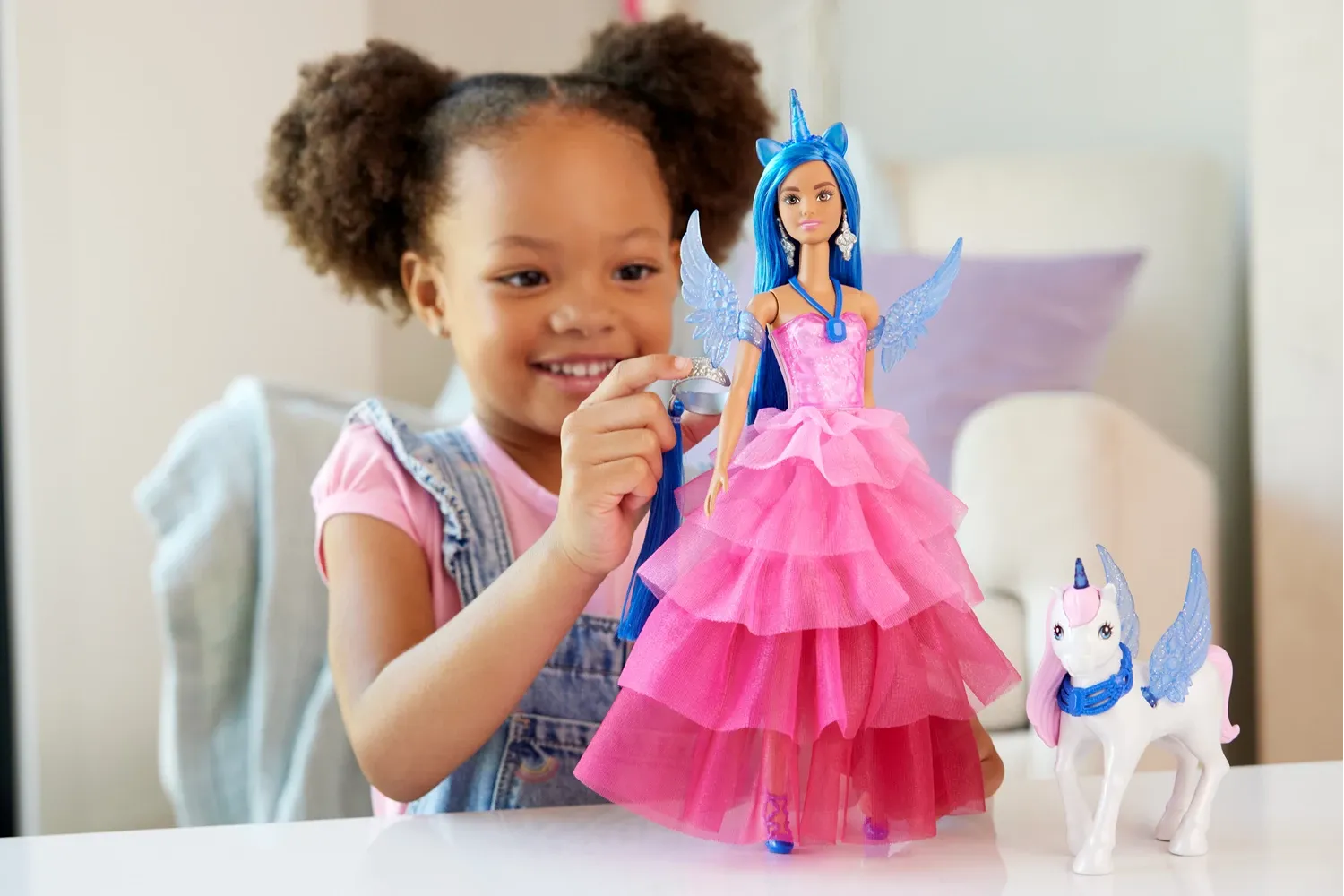 Barbie Saphire Doll Mit dieser bezaubernden Puppe können Kinder den 65. Geburtstag von Barbie feiern! Inspiriert von ihrer Figur in Barbie Ein verborgener Zauber trägt sie als atemberaubendes geflügeltes Einhorn ein rosa-pinkes Kleid mit Farbverlauf. Ihr blaue...
