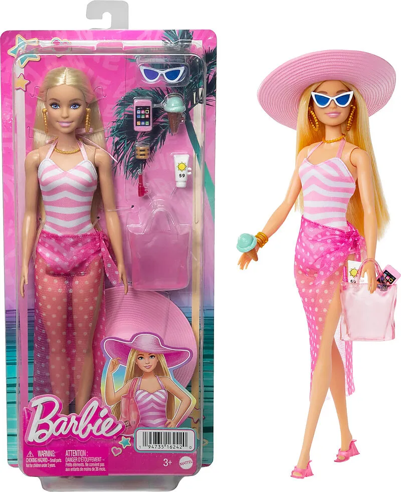 Barbie Beach Day Barbie Die Zehen im Sand, ein Eis in der Hand und schon ist diese blonde Barbie-Puppe bereit für einen entspannten Tag in Malibu. Sie trägt sommerliche, pinke Badebekleidung und hat eine Tragetasche voller Strandaccessoires. Kinder ab 3 Jahren...