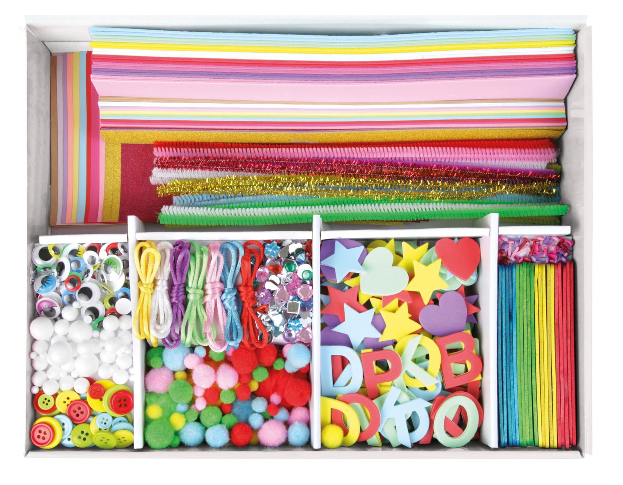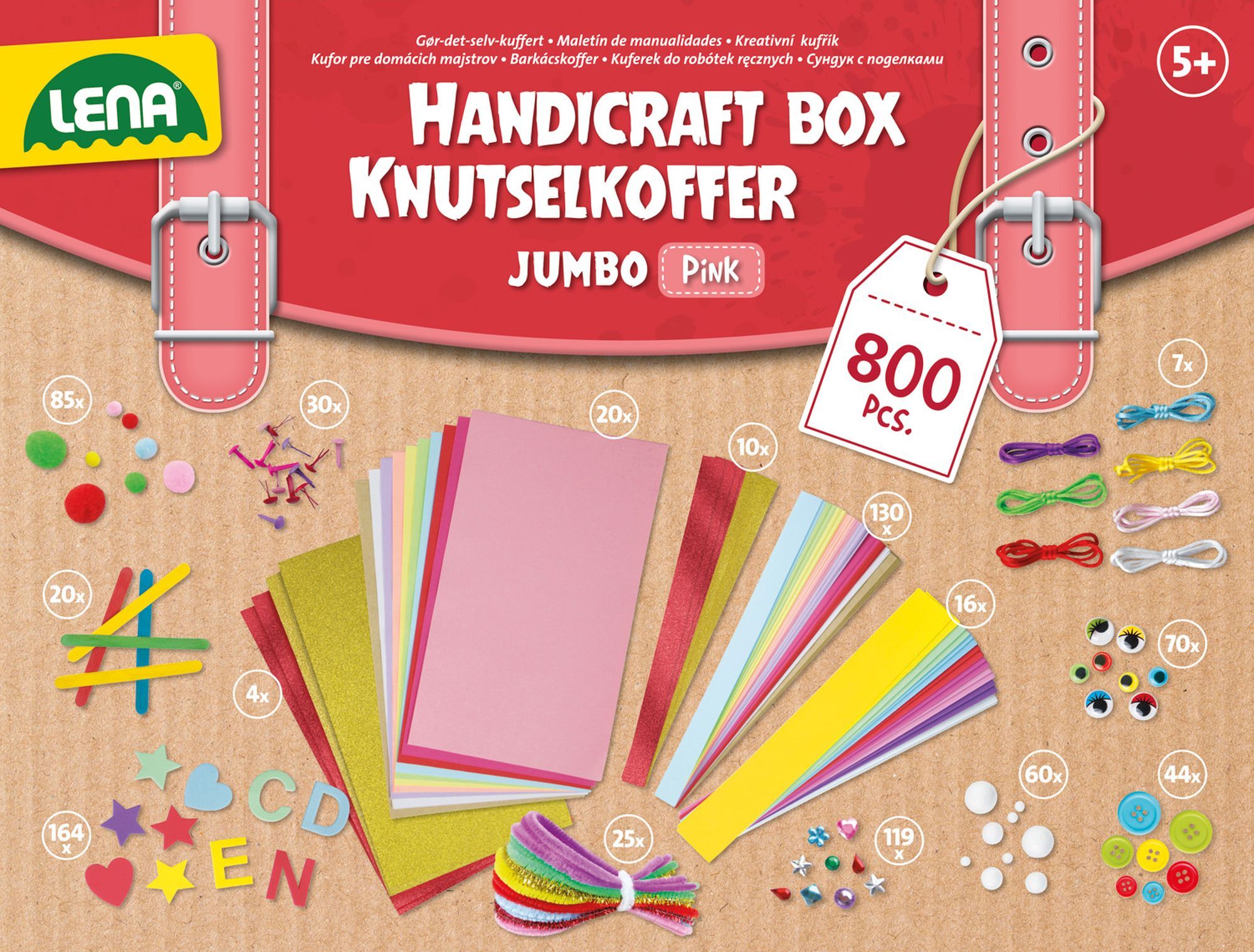 Bastelkoffer Jumbo pink LENA® Bastelkoffer Jumbo pink enthält 17 verschiedene hochwertige Bastelmaterialien, wie z.B. glitzernde Strassteine, Knöpfe, buntes Papier, Moosgummiteile, Pfeifenreiniger, Wackelaugen, Pompons, bunte Eisstiele, Styroporkugeln, Bänder ...