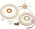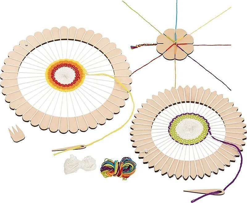 Holzspielzeug zum Weben und Knüpfen.