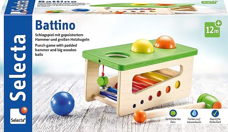 Schlagspiel mit gepolstertem Hammer und 3 großen Holzkugeln. Das Schlagspiel für Kinder ab 1 Jahr. 3 große Kugeln wollen durch die sorgfältig gefrästen Öffnungen geklopft werden. Laut oder leise? Holz oder Filz - der Hammer kann ganz nach Belieben eingesetzt w...
