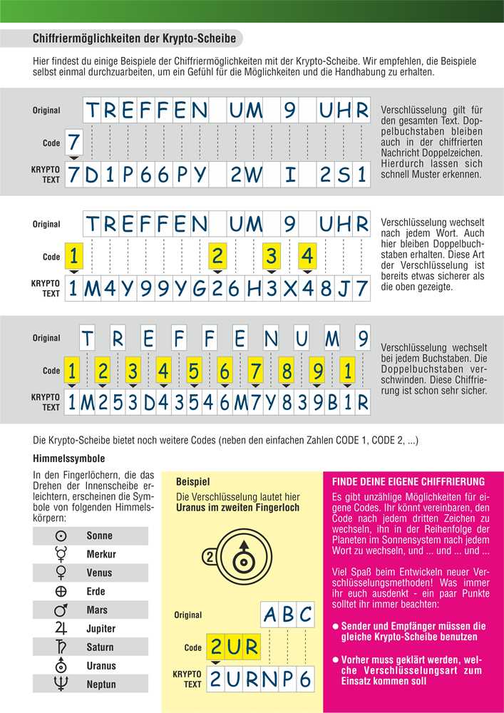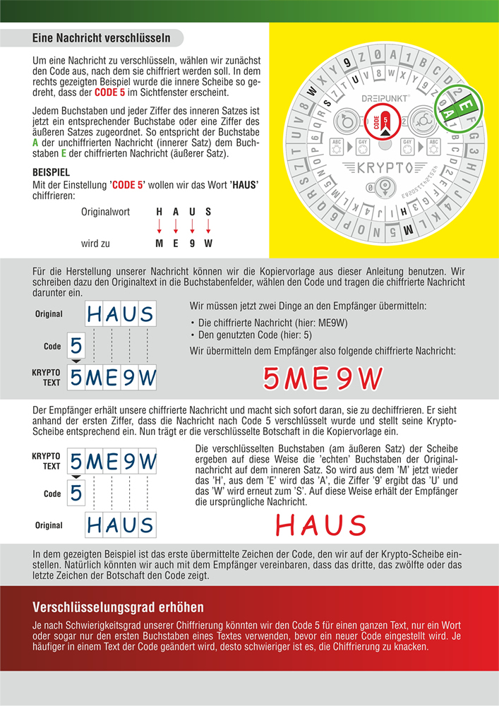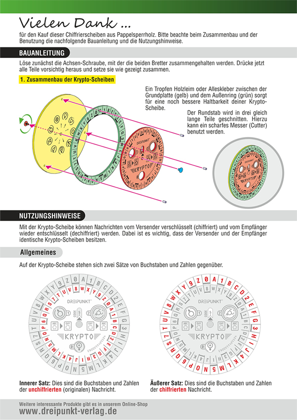 DAS unerlässliche Werkzeug für jeden angehenden Spion, Agenten oder Detektiv: Mit dieser Krypto-Scheibe kannst du Nachrichten in Sekundenschnelle verschlüsseln, so dass nur jemand, der im Besitz der gleichen Krypto-Scheibe ist, sie entschlüsseln kann! Ihr eini...
