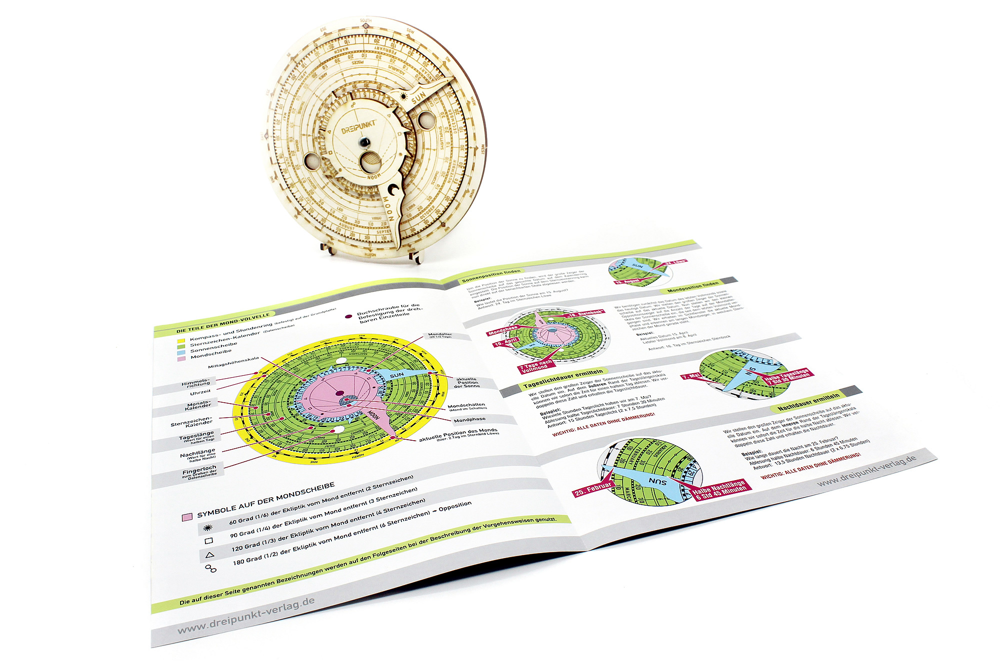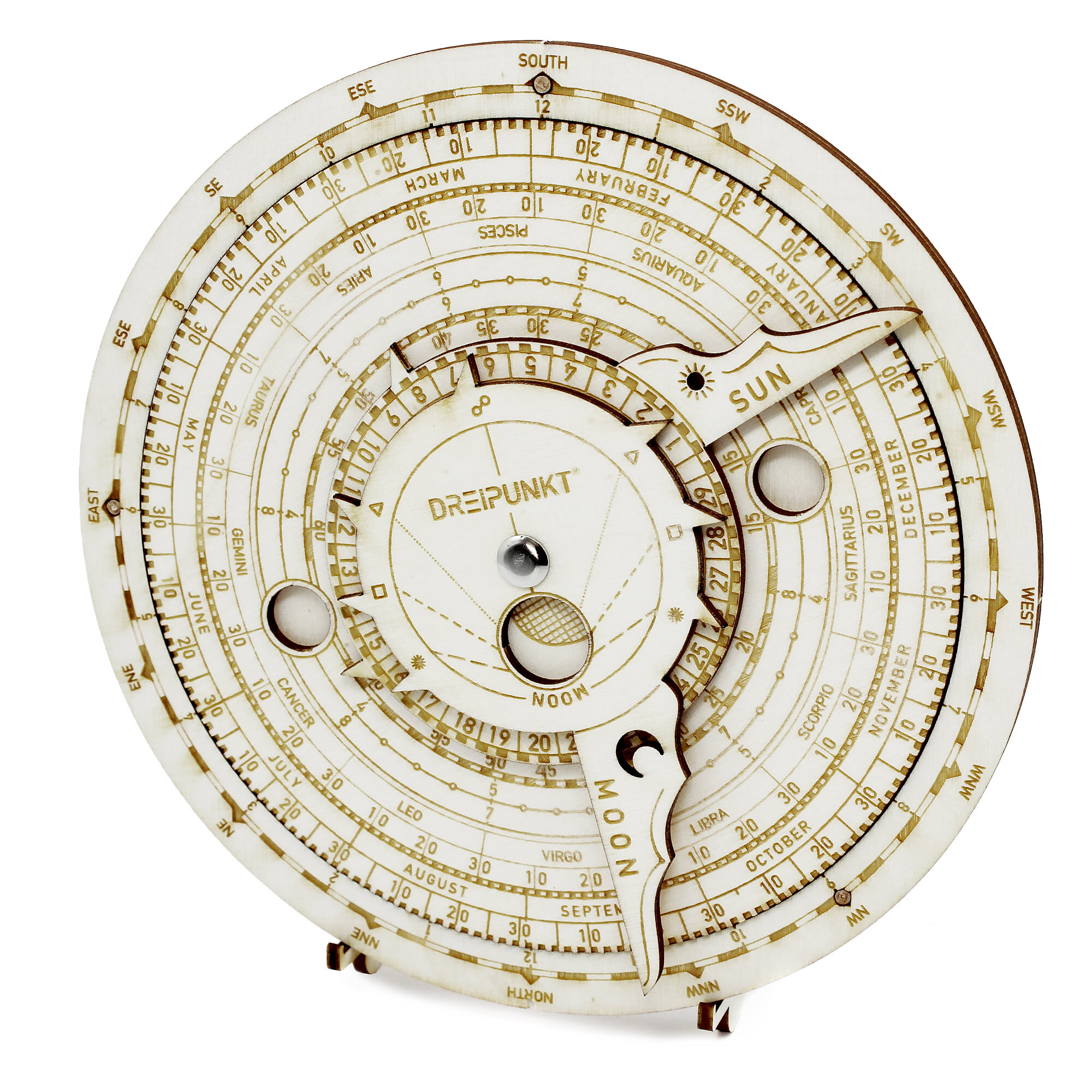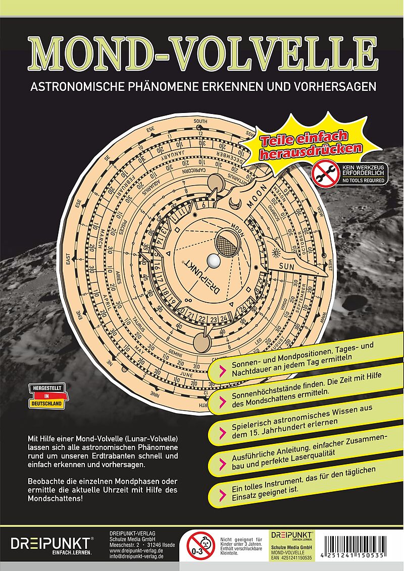 Holz-Modellbausatz einer funktionsfähigen Mond-Volvelle. Die Mond- bzw. Lunar-Volvelle ist ein astronomisches Werkzeug, das in der Vergangenheit zur Vorhersage und Bestimmung astronomischer Ereignisse diente. So können z.B. die Positionen von Sonne und Mond be...