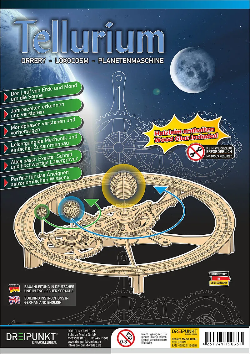 Ein Tellurium (auch: 'Planetenmaschine', Orrery oder Loxocosm) ist ein faszinierendes mechanisches Gerät, das die Bewegung von Planeten um die Sonne zeigt. In diesem Modell sind die Sonne, die Erde und der Mond dargestellt, so dass besonders die Mond...