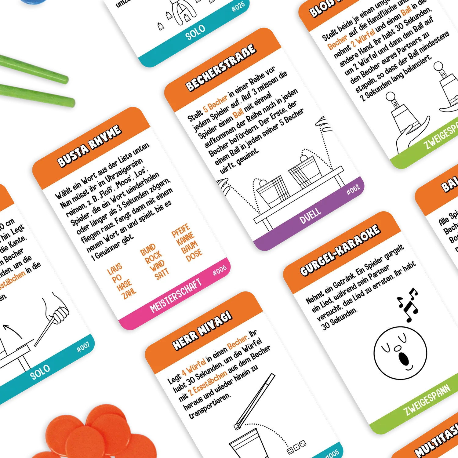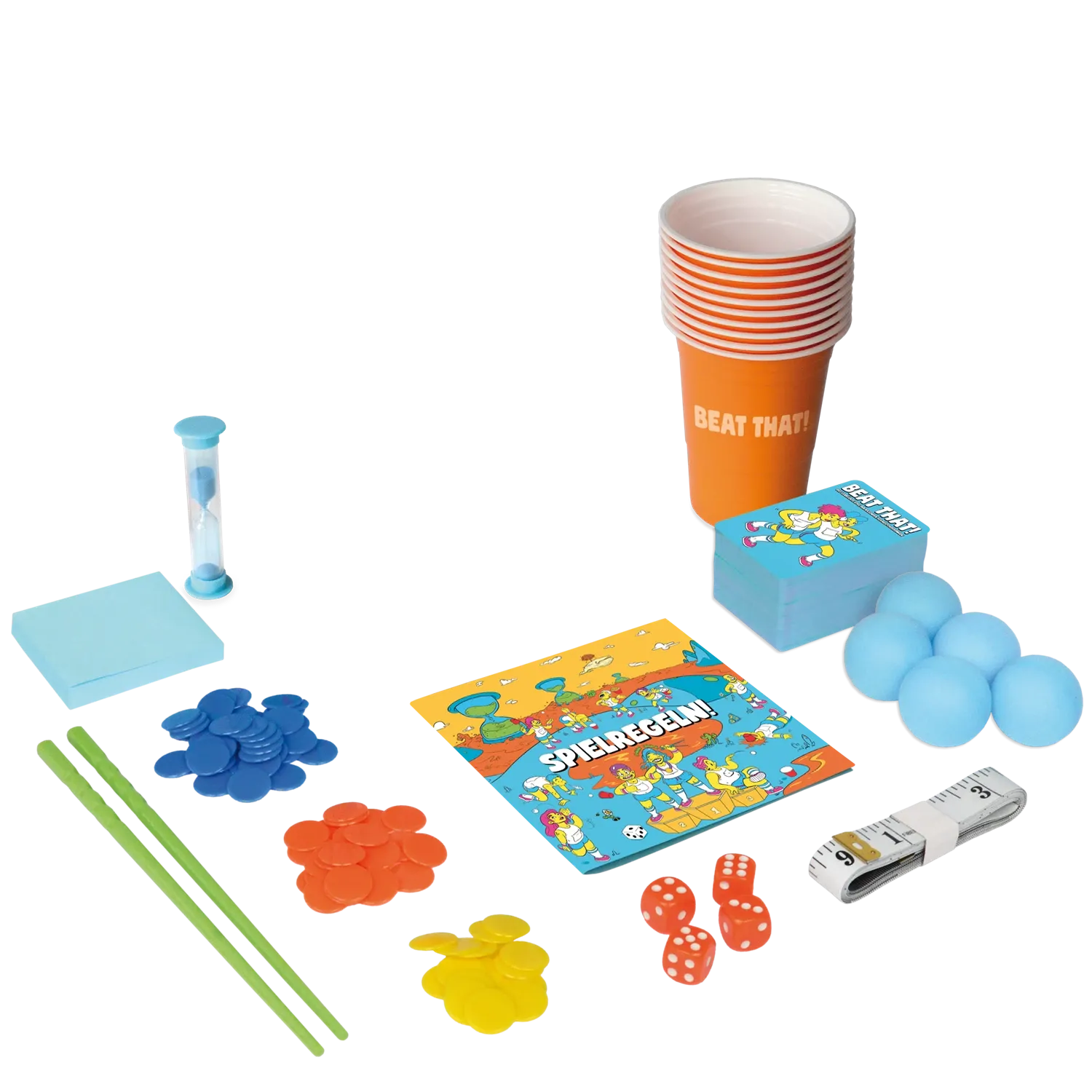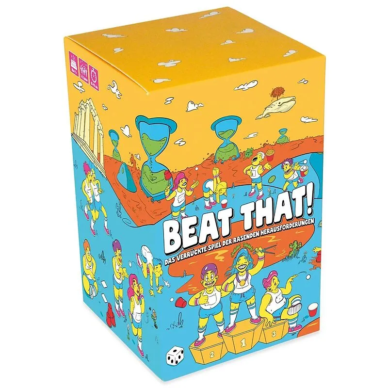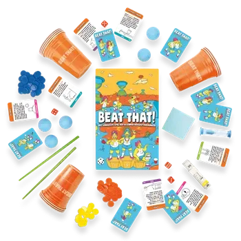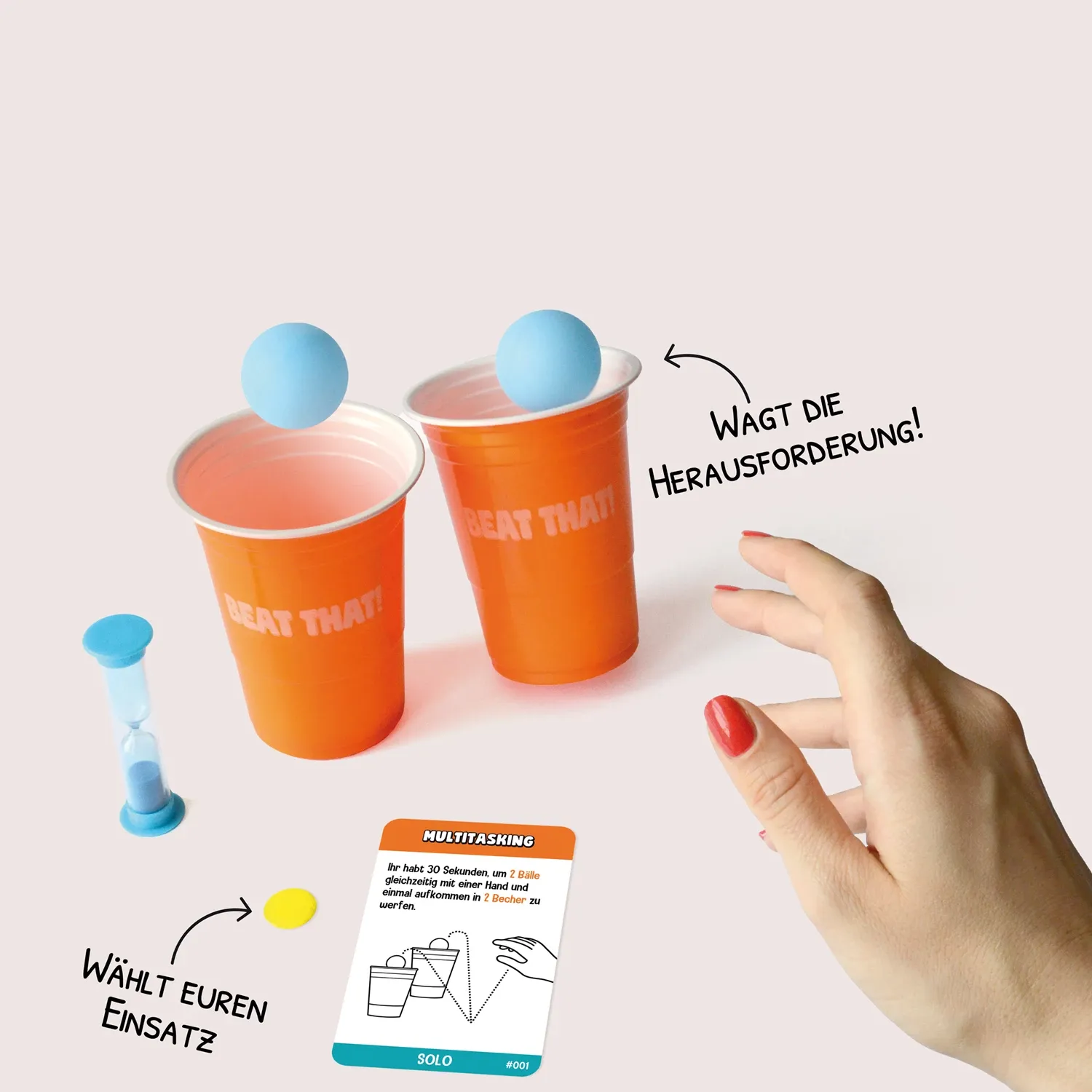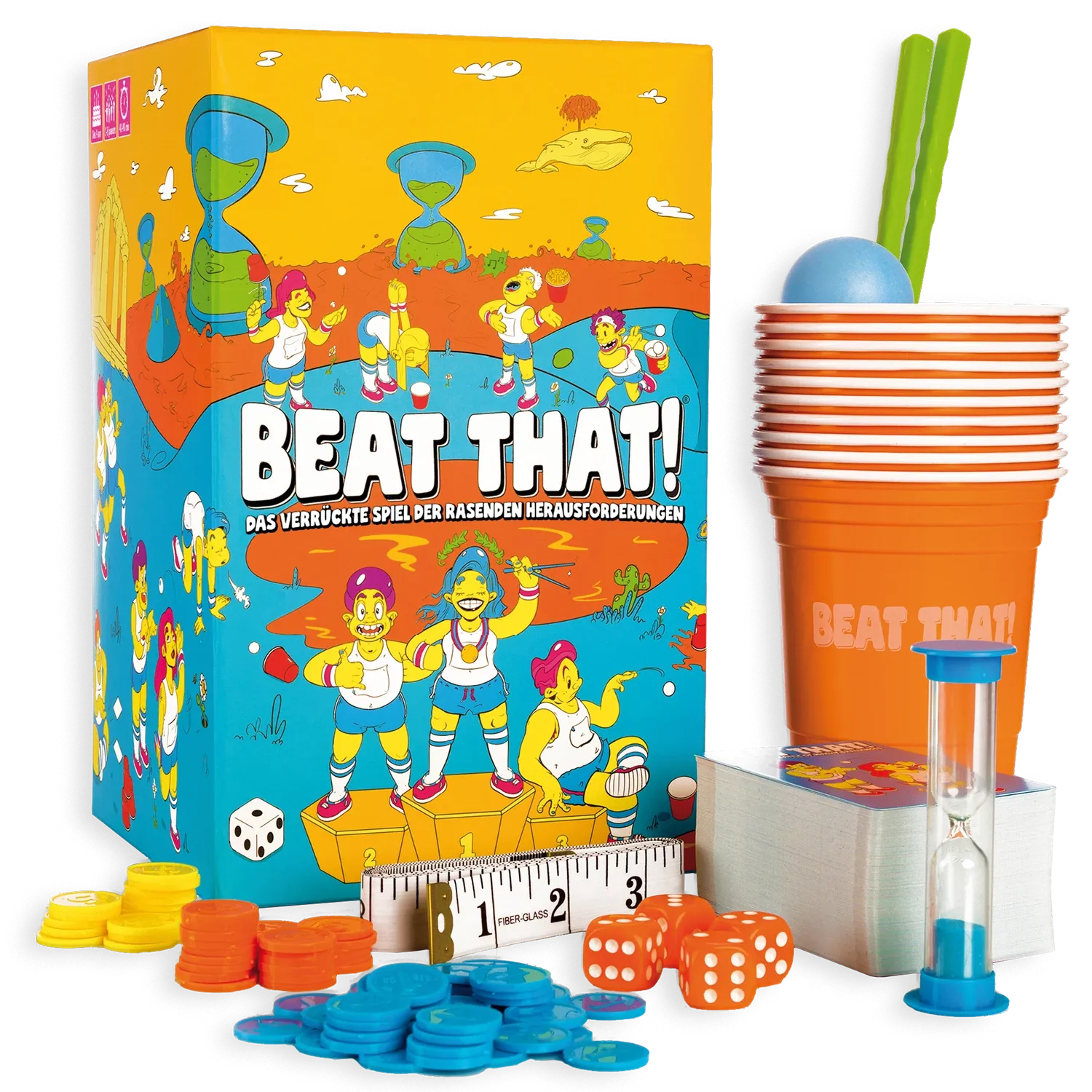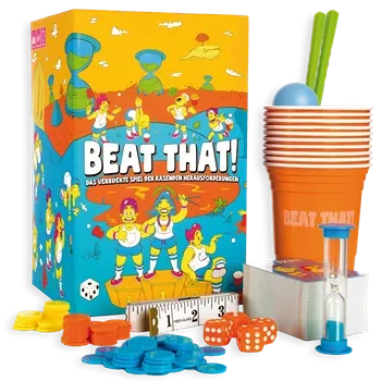 Beat That! Das verrückte Spiel der rasenden Herausforderungen! Macht euch schon mal locker, denn jetzt müsst ihr werfen, kippen, stapeln, schnipsen, hüpfen, pusten, balancieren und katapultieren, um das verrückteste Partyspiel der Welt zu gewinnen! Ziel ist, m...