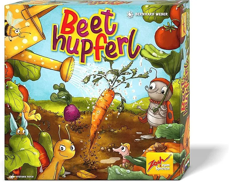 Beethupferl Jedes Kind bekommt eine gut greifbare Gießkanne aus Pappe, in die es blaue Murmeln als Wassertropfen füllt. Das dreidimensionale Gemüsebeet besteht aus Kuhlen, die durch Ackerplättchen bedeckt sind. Lässt ein Spieler einen Wassertropfen über das ''...