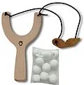 Holz-Schleuder mit 10 Papierkugeln. Die Papierkugeln haben einen Durchmesser von 2-3 cm.