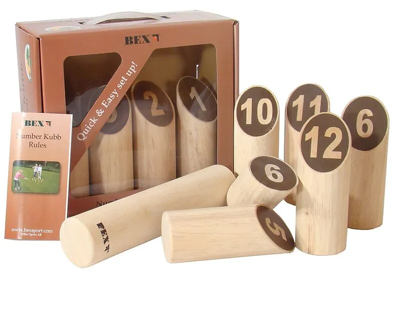 Nummern-Kubb ist ein Wurfspiel mit Zahlen. Dieses hochwertige Spiel aus Schweden ist aus hochwertigem Gummibaum/Kautschukbaum aus Plantagenanbau. Mit dem Wurfholz auf Hölzer mit Nummern gezielt, um zuerst 50 Punkte zu erreichen. Hier sind Taktik und Geschick g...