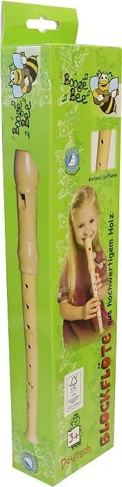 Boogie Bee Blockflöte Holz mit deutscher Griffweise. Länge ca. 32 cm. Inklusive Flötenputzer. Auf Blisterkarte. Kartengröße: 13.5x39.5cm. Für Kinder ab 3 Jahren.