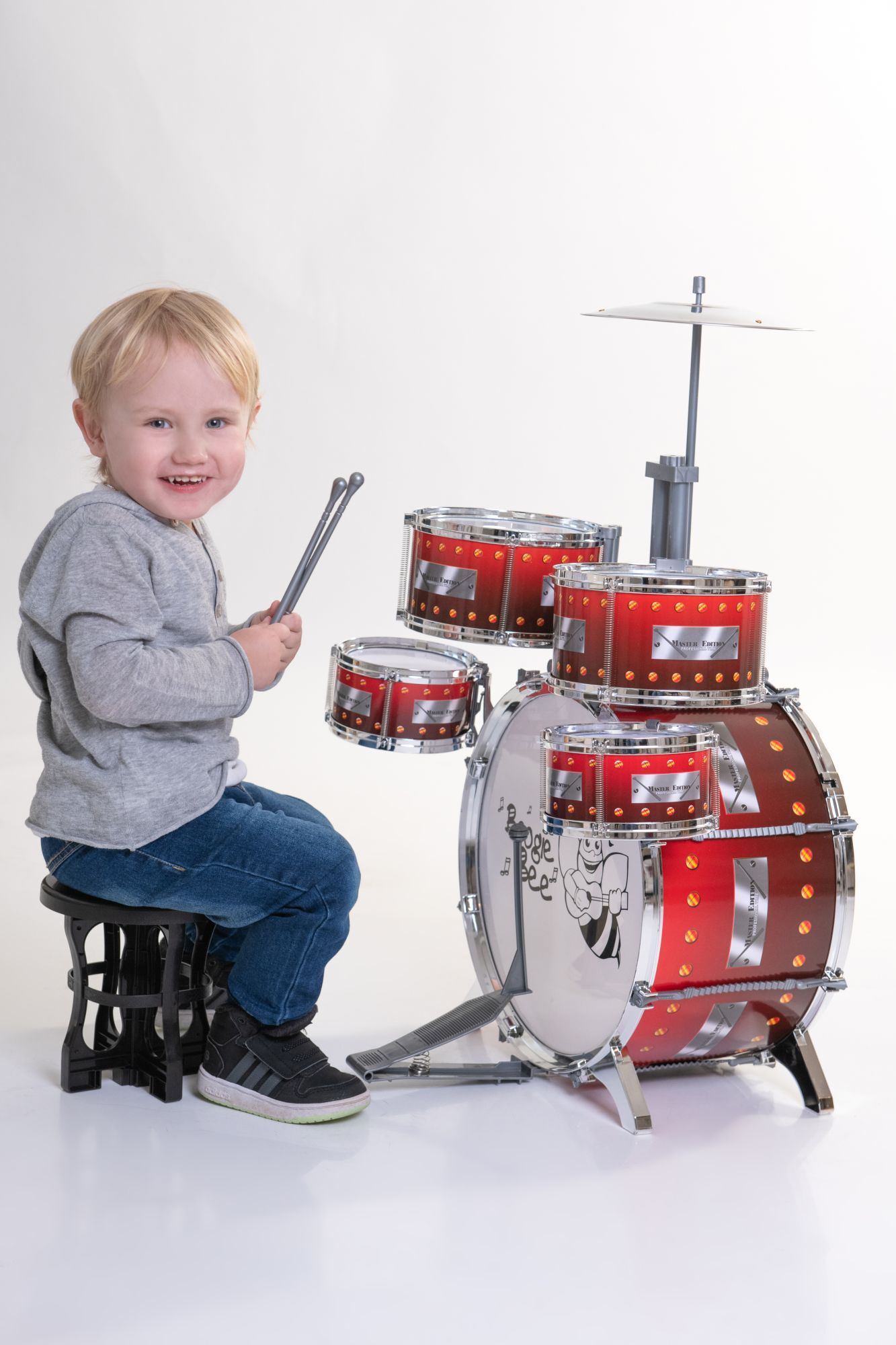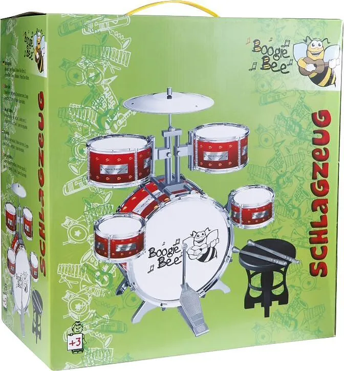 Boogie Bee Schlagzeug ist ein robustes Schlagzeug mit Basstrommel und Pedal, 2 kleinen Tom Toms, 2 große Tom Toms, 1 Hi-Hat, 1 Paar Trommelstöcke und Hocker. Maße ca. 75x58x41 cm. Für Kinder ab 3 Jahren.