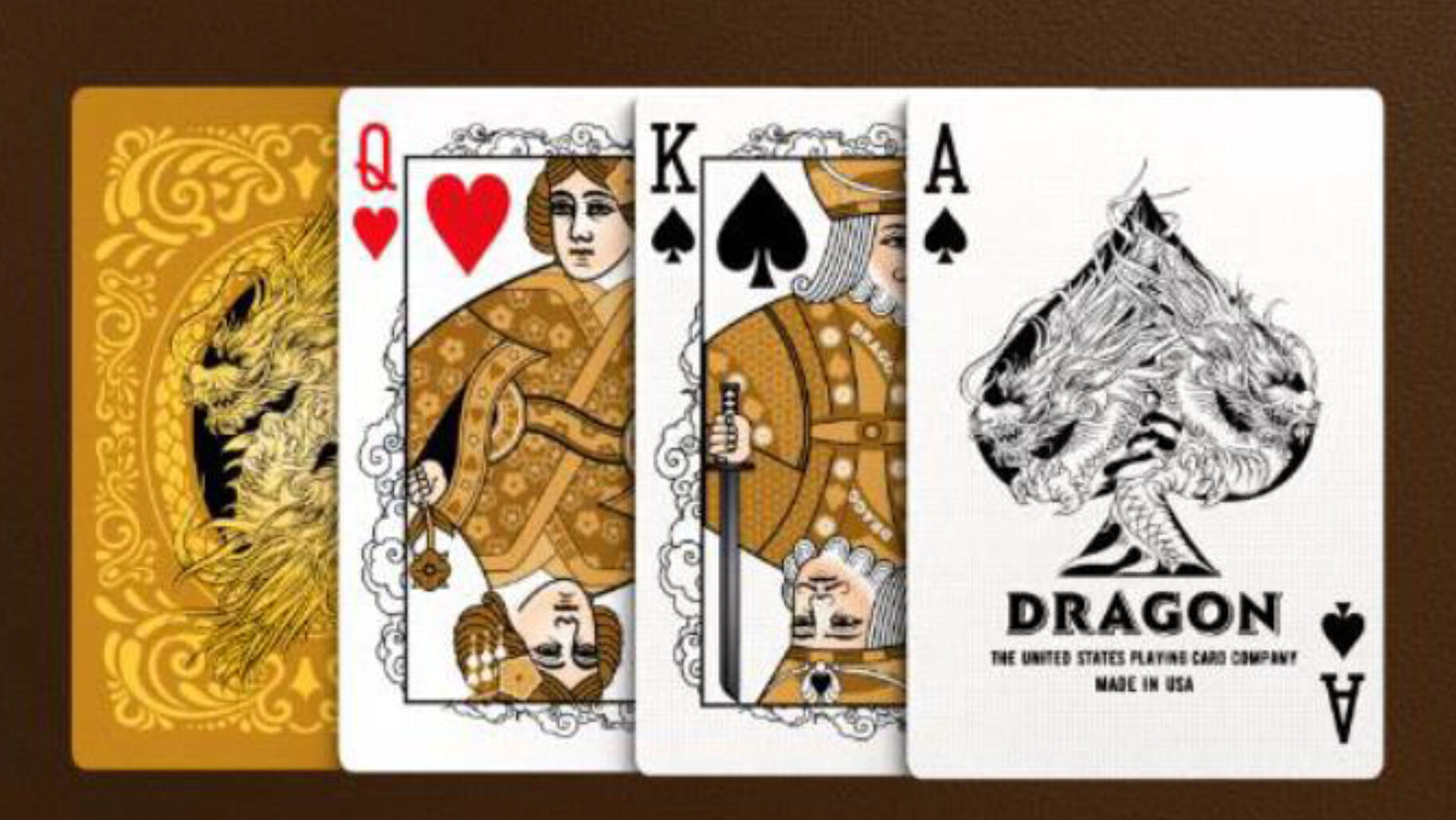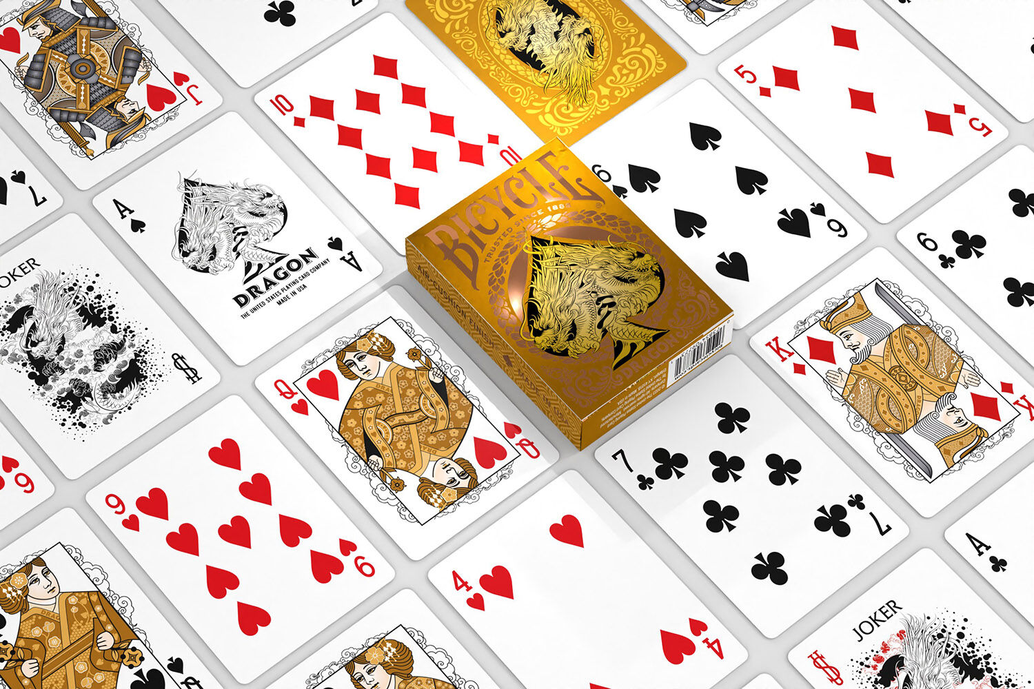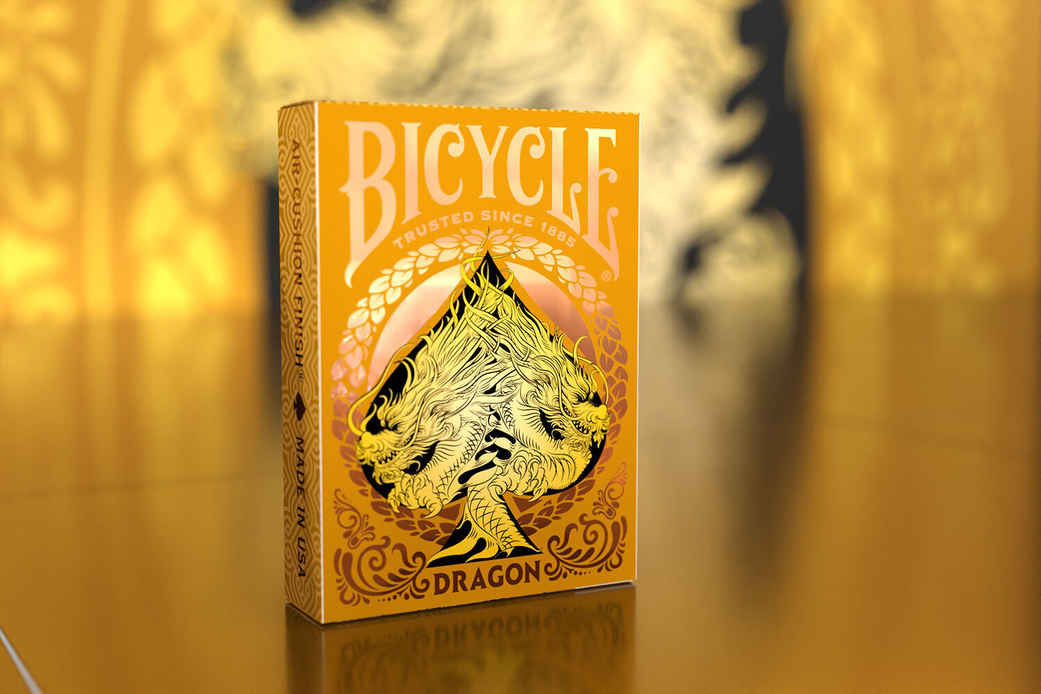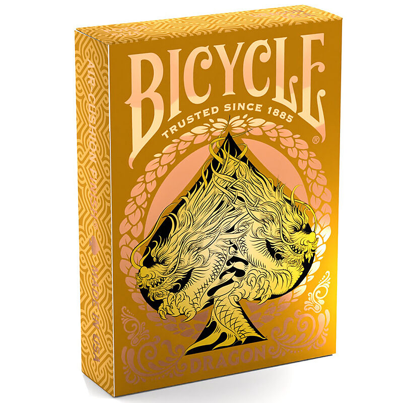 Dragon inspired character art on card facesCustom card back designGold foil accents on tuck caseAir Cushion Finish