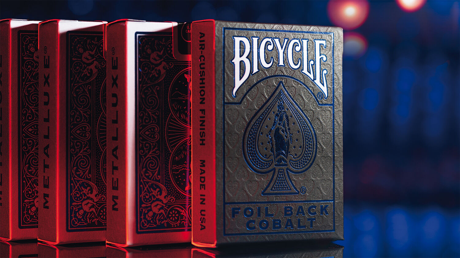 • holzkohlegraue, strahlende Premium-Verpackung mit Prägung • Spezielle Farben auf den Kartenvorderseiten Die originale Rider Back-Rückseite ist mit einer patentierten MetalLuxe® Metallfolie veredelt, wird dann mit der speziellen Bicycle-Beschichtu...