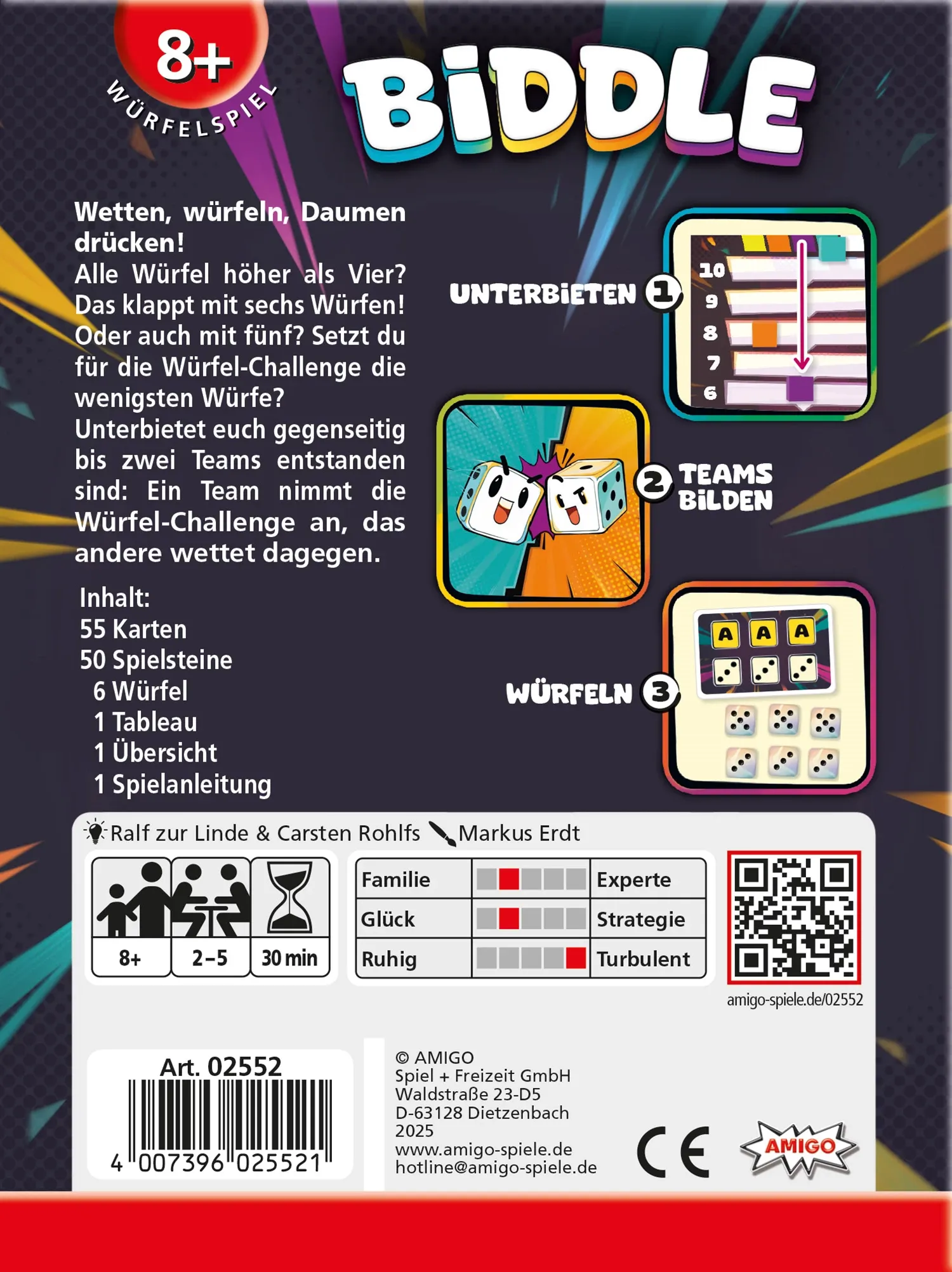 Biddle Wetten, würfeln, Daumen drücken! Alle sechs Würfel müssen einen höheren Wert als Vier zeigen? Das klappt mit sechs Würfen! Oder auch mit fünf - oder weniger? Die Mitspielenden unterbieten sich gegenseitig bis zwei Teams entstanden sind: Ein Team setzt d...