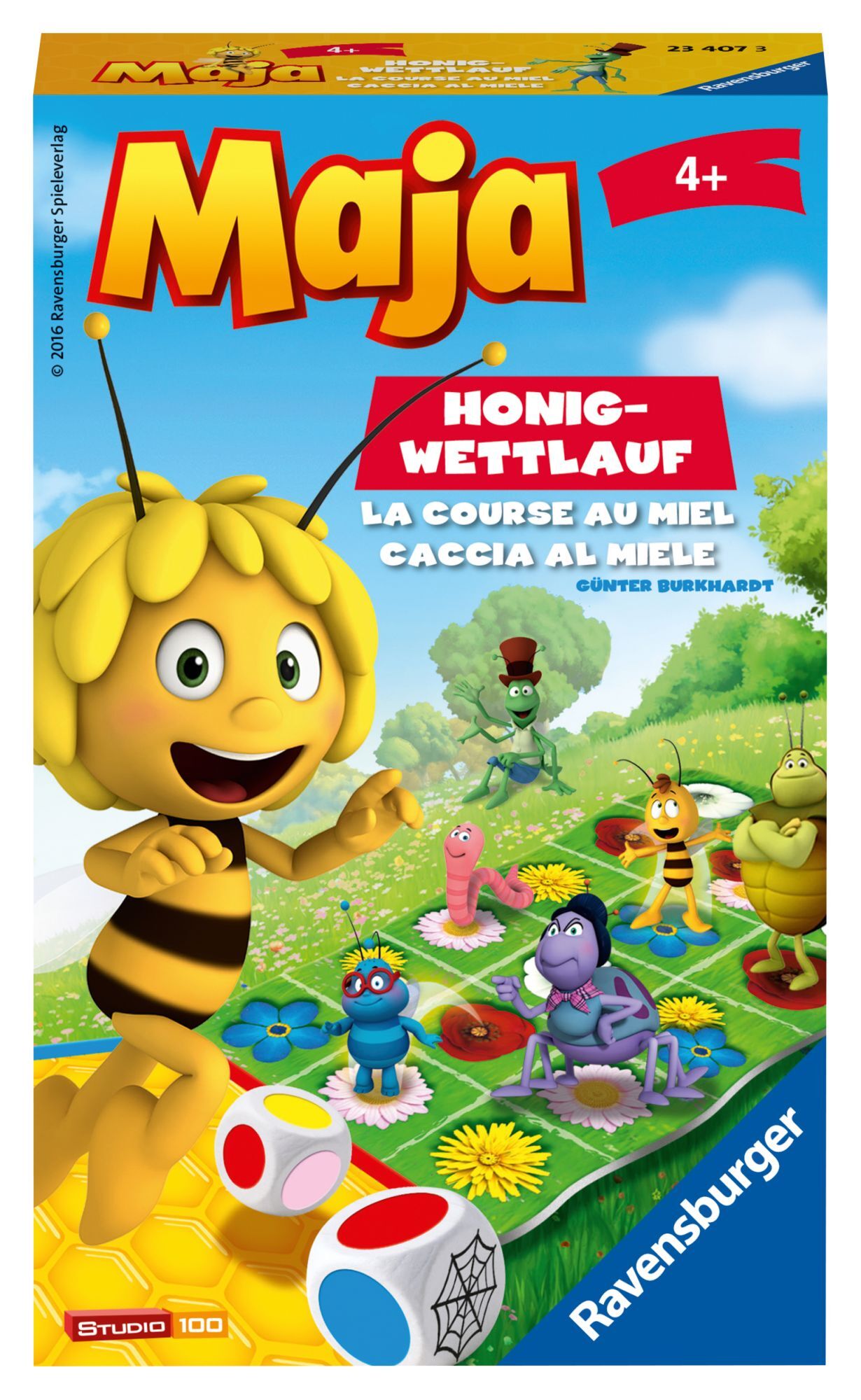 Inhalt5 Blumenwiese-Spieltafeln, 1 Honigtafel, 10 Spielfiguren, 2 Spinne Thekla-Spielfiguren, 12 Aufsteller, 2 Farbwürfel mit Symbol