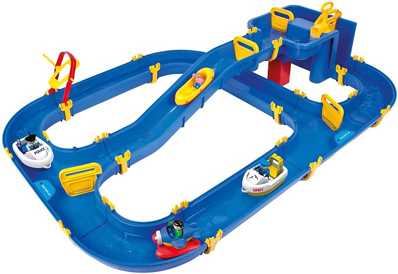 BIG-WATERPLAY Set: Niagara. Mit einem Staubecken mit Pumpe und zwei Schleusen, einer abschüssigen Wasserbahn, einer Handkurbel zum Herausheben sowie drei verschiedenen Booten und einem Wasserflugzeug gibt es für die vier Spielfiguren immer neue Abenteuer zu er...