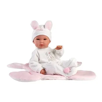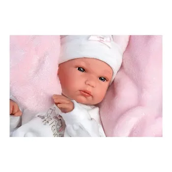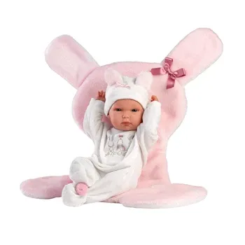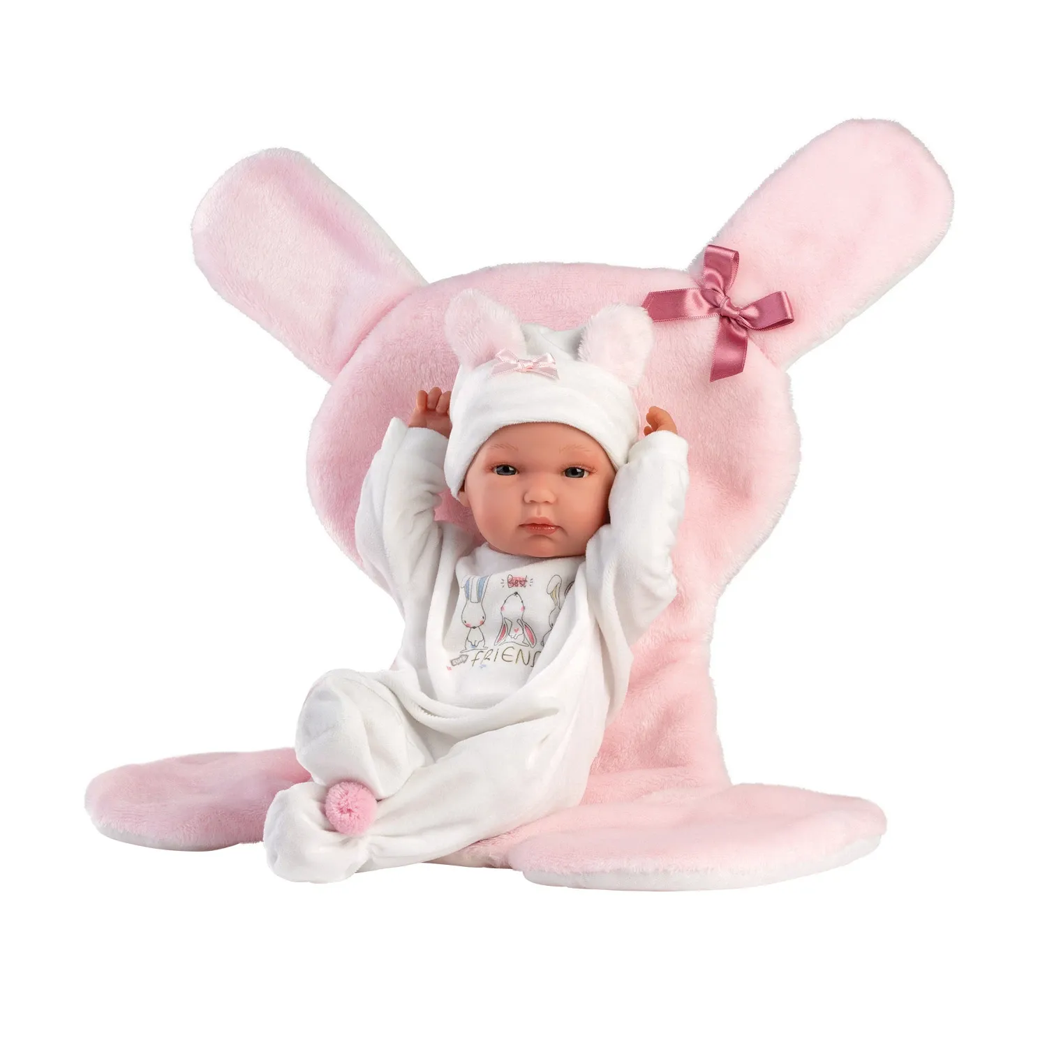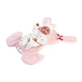 35cm grosse Babypuppe mit blauen Augen und Geschlechtsmerkmal (Mädchen), komplett aus zartem Vinyl. Sie trägt einen Schlafanzug und Wollmütze. Inklusive flauschiger Hasendecke in zartem rosa.