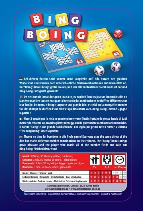Bei diesem flotten Spiel kommt keine Langweile auf! Einfach zu spielen und mit gehörigem Würfelspaß Bing Boing verleiht dem Bingo-Prinzip eine frische, neue Note. Bei diesem flotten Spiel kommt keine Langweile auf! Alle nutzen den gleichen Würfelwurf und kreuz...