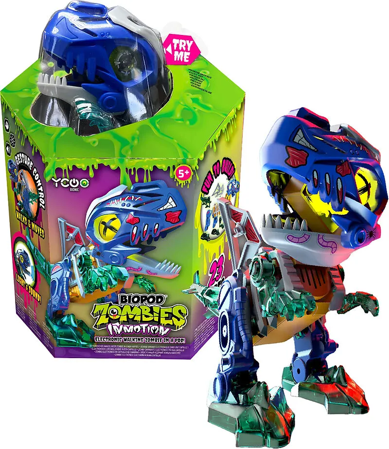 Baue zuerst den 16.6 cm hohen Biopod Zombie InMotion aus 23 Teilen zusammen. Dann beginnt das Spiel: steuere seinen Gang und seine Bewegungen mit Handbewegungen. Die LED-Augen des Zobmies leuchten, und auf Knopfdruck brüllt er.