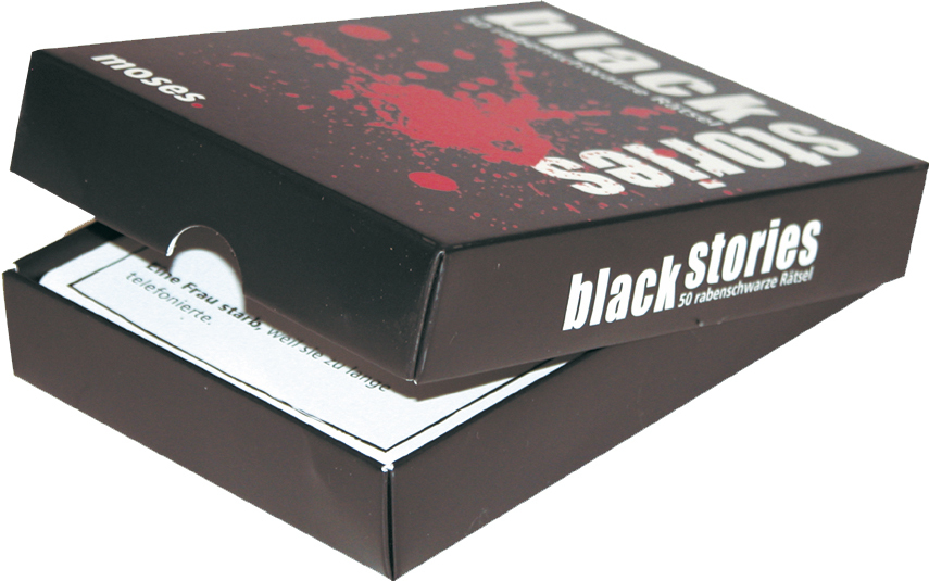 black stories 1 Sie sind schwarz, rätselhaft und durch und durch böse: black stories - Das ist DIE Kultreihe bei moses. und das schon seit über 10 Jahren! In den morbiden, gruseligen, erschreckenden und zum Teil unterhaltsamen Rätseln geht es um den Tod und Un...