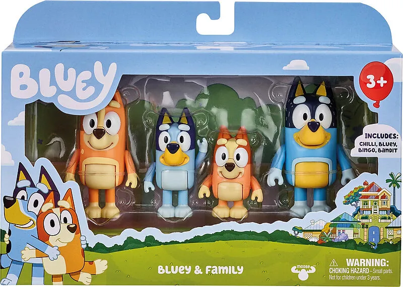 mooseToys BLUEY Figuren 4er pack - Familie Dieses 4-teilige Figurenset enthält Blueys ganze Familie: Bluey, Bingo, Bandit (Dad) und Chilli (Mum). Alle Figuren in diesem Set haben bewegliche Gelenke an Armen und Rumpf. Mit diesen süßen Figuren können Kinder ihr...