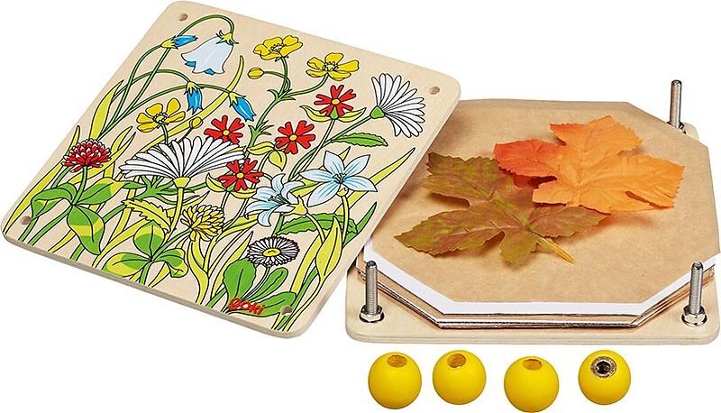Hura, hura, der Herbst ist da. Mit den griffigen Schraubverschlüssen aus Holz und die Pappeinlagen lassen sich ganz einfach Blumen- und Blätterabdrücke auf Papier pressen.