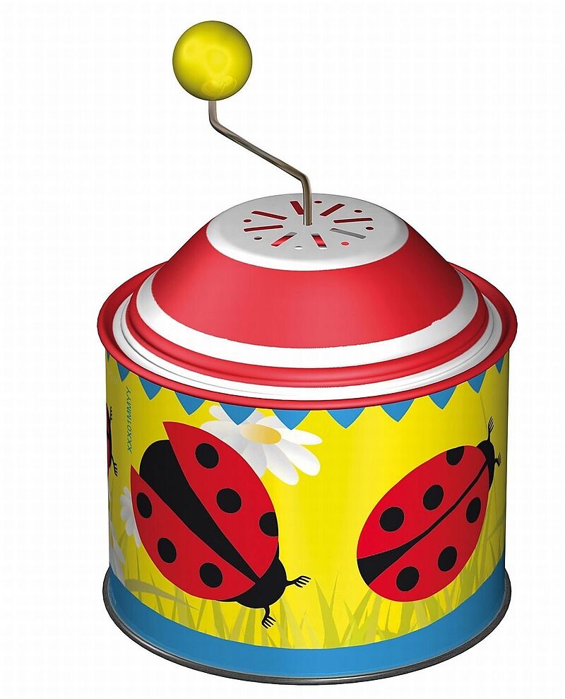 Die Musikdrehdose Glückskäfer hat einen Durchmesser von ca. 7,5 cm. Beim Drehen der Kurbel erklingt die Melodie "Der Frühling". Größe: 11cm x 8cm x 8cm. Sie ist für Kinder ab 12 Monaten geeignet.