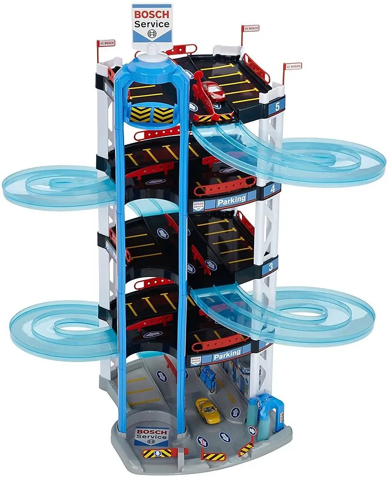 Theo Klein Bosch Parkhaus mit 5 Ebenen Bosch Car Service Parkhaus mit 5 Ebenen - Parkhaus mit doppelter Abfahrtrampe für Rennen: - Mit 2 Bahnen für 2 kleine Autos oder - Mit 1 Bahn für 1 großes Auto - Mit Fahrstuhl, Tanksäule, Waschstraße und 2 Autos - Höhe de...