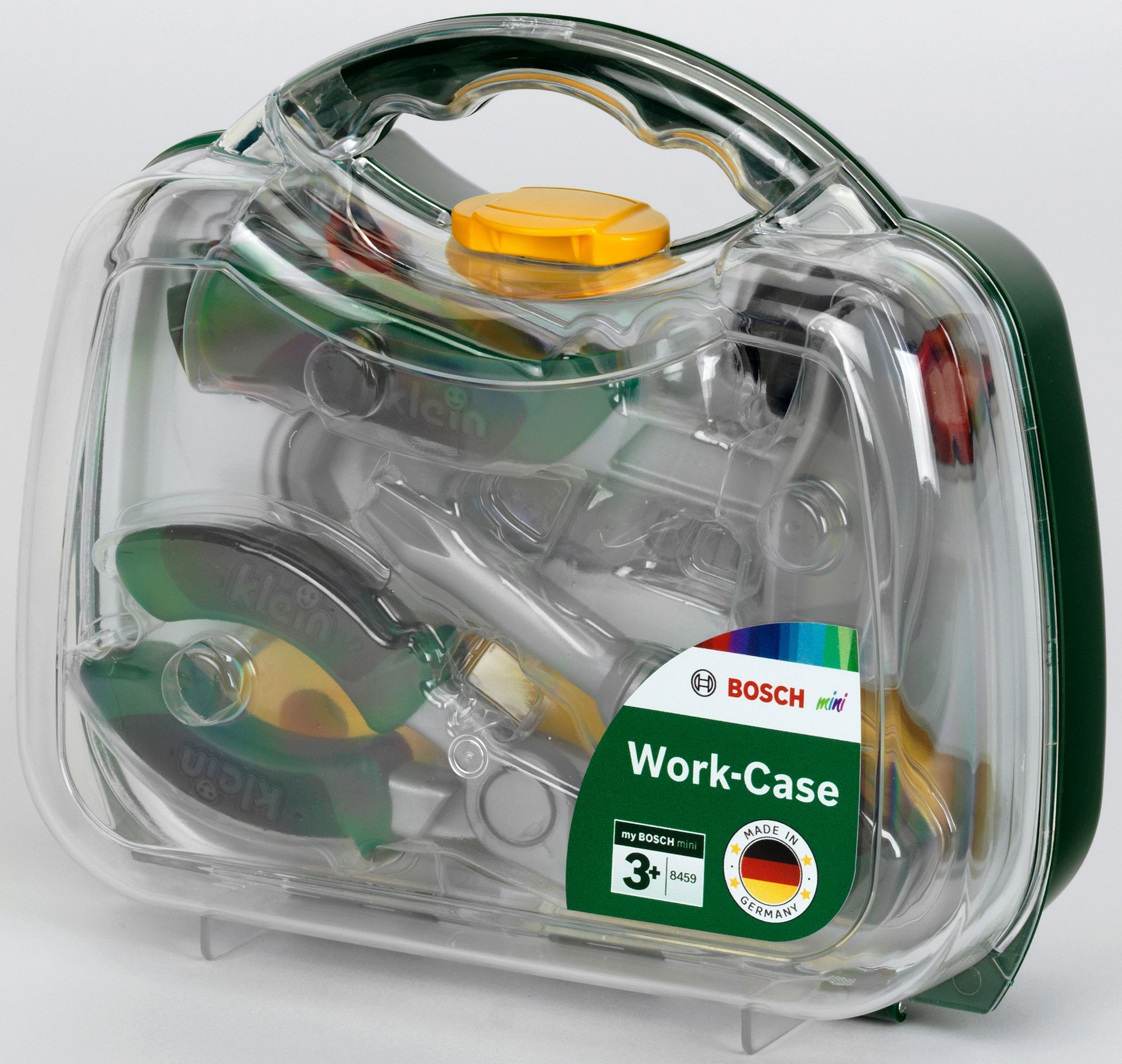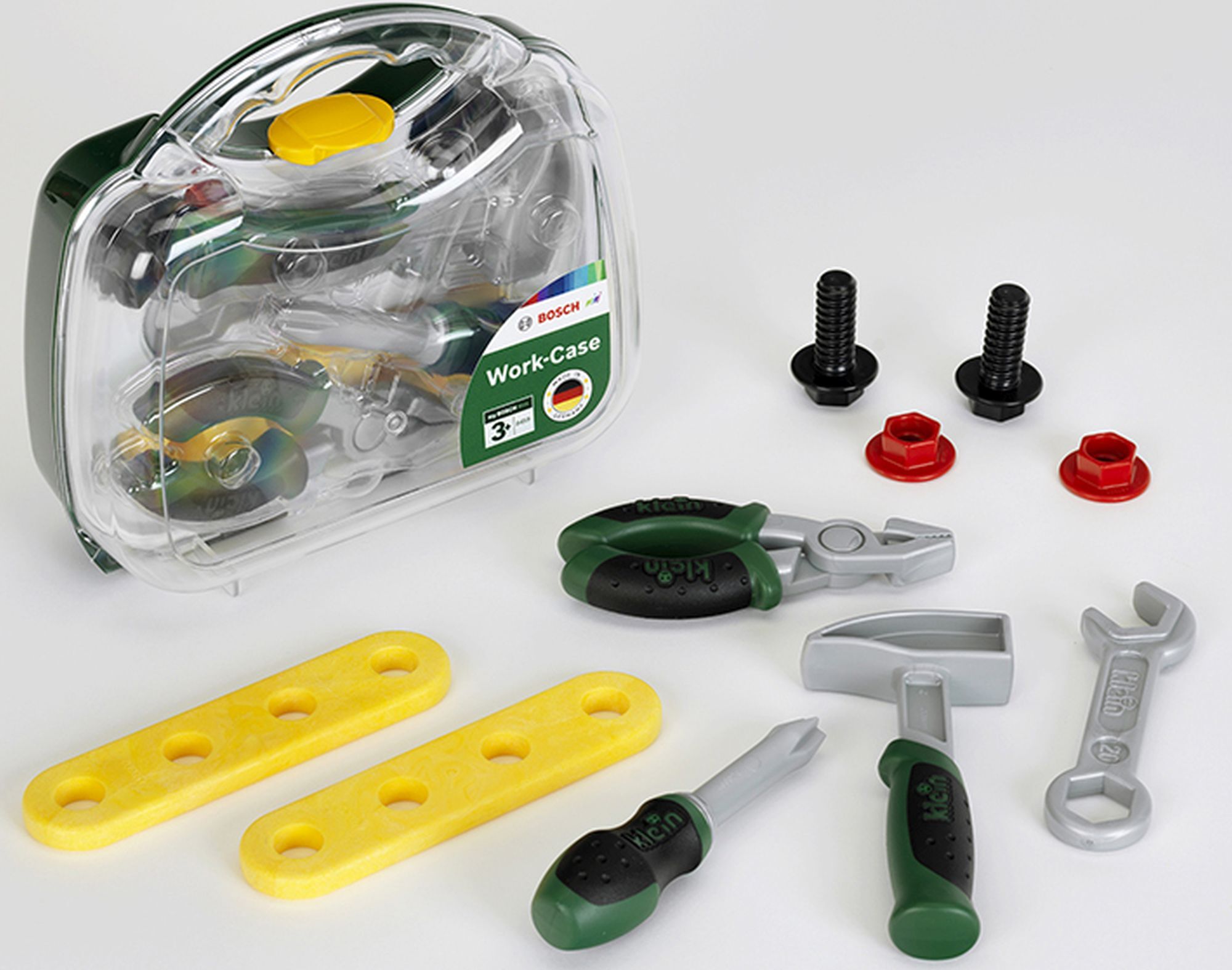 Mit praktischem Tragegriff und transparenter Frontseite Mit zahlreichen Zubehör für kleine Handwerker: Hammer, Zange, Schraubenschlüssel, Schraubendreher, Latten, Schrauben und Muttern. Ab 3 Jahren.