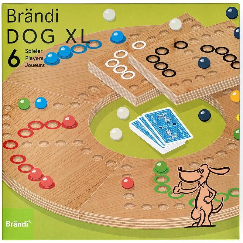 Das erfolgreiche Brändi Dog Spiel gibt es auch in der XL Version. Das Spielbrett mit dem edlen Kirschholz-Design ist optisch eine Augenweide und passt in jedes Wohnzimmer. Die extra grossen Murmeln garantieren doppelten Spielspass. Mit einem raffinierten Magne...