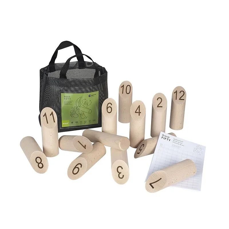 Das Brändi Fifty ist ein Geschicklichkeitsspiel aus Finnland. Das Spielprinzip ist simpel, man wirft mit einem Wurfholz auf die zwölf stehenden Spielkegel. Wer zuerst exakt 50 Punkte erreicht, gewinnt das Spiel. Aufgrund der kompakten Grösse ist das Spiel lei...