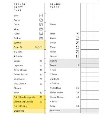 Der Ersatzblock für das Brändi Yatzy Plus. Für die Varianten Standard und Plus. Der Ersatzblock besteht aus 50 Blättern, vorne und hinten bedruckt.