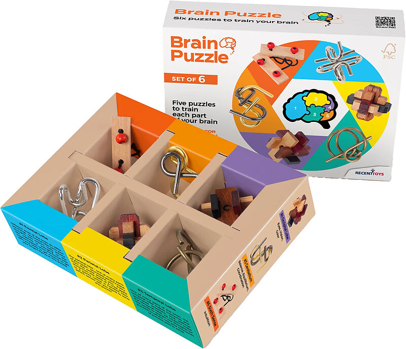 Verschiedene Bereiche des Gehirns sind für verschiedene Sachen zuständig. Diese Sammlung von Aufgaben besteht aus 6 Herausforderungen jedes Knobelspiel ist mit einem Teil des Gehirns verbunden. 3 Sets aus Holz, 3 Sets aus Metall.