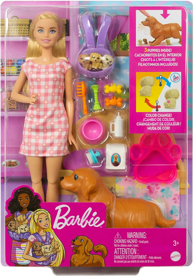 Barbie Puppe (blond) mit Hund und Welpen Überraschung! Barbies bezaubernde Hündin ist schwanger! Mit dem neuen Barbie Welpen-Spielset können Kinder der Barbie-Puppe dabei helfen, drei zauberhafte Welpen auf die Welt zu bringen, indem sie auf den Rücken der Hün...
