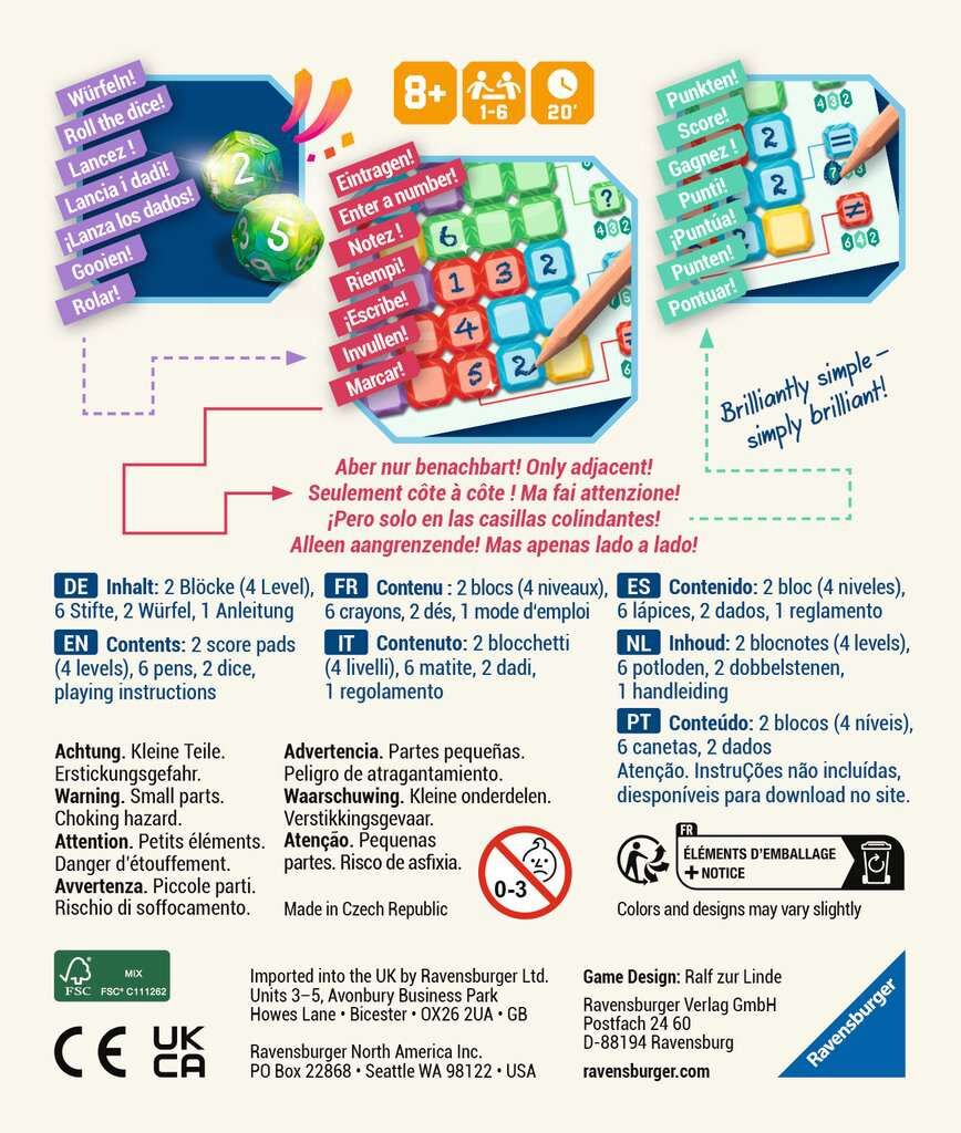 #Brilliant# ist ein Roll & Write Spiel mit einem ganz besonderen Clou:Von zwei gewürfelten Zahlen muss eine der beiden neben die andere (bereits eingetragene Zahl) eingetragen werden. Das ist schnell verstanden und schnell gespielt, da alle gleichzeitig spiele...