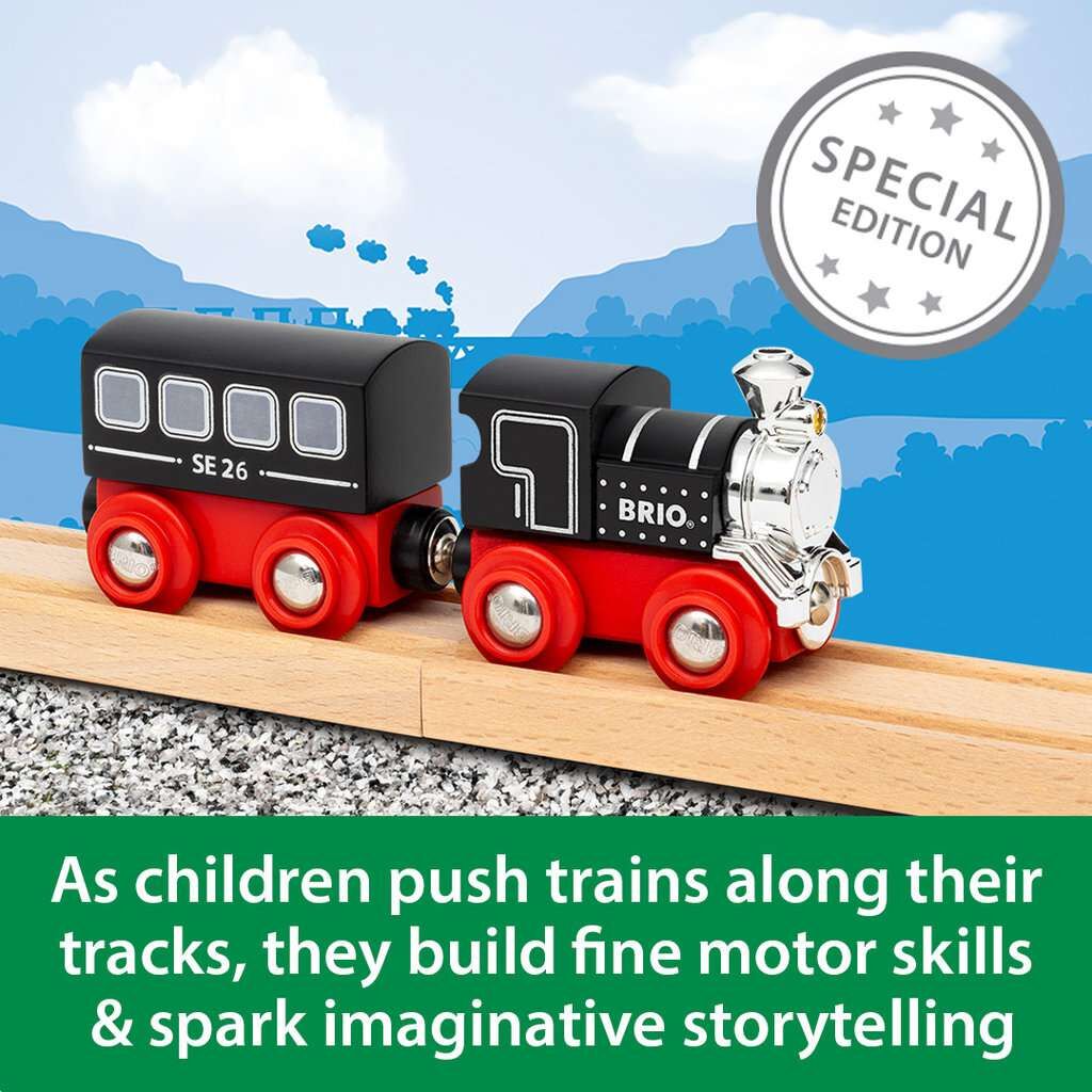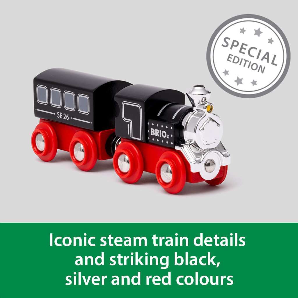 Alle einsteigen in den 36140 Sonderzug für 2026. Dieser limitierte Dampfzug ist zwar klein, hat es aber in sich: Mit seinem auffälligen Design in Schwarz, Silber und Rot ist er ein echter Blickfang in jeder BRIO World Eisenbahnanlage. Mit seinen klassischen De...