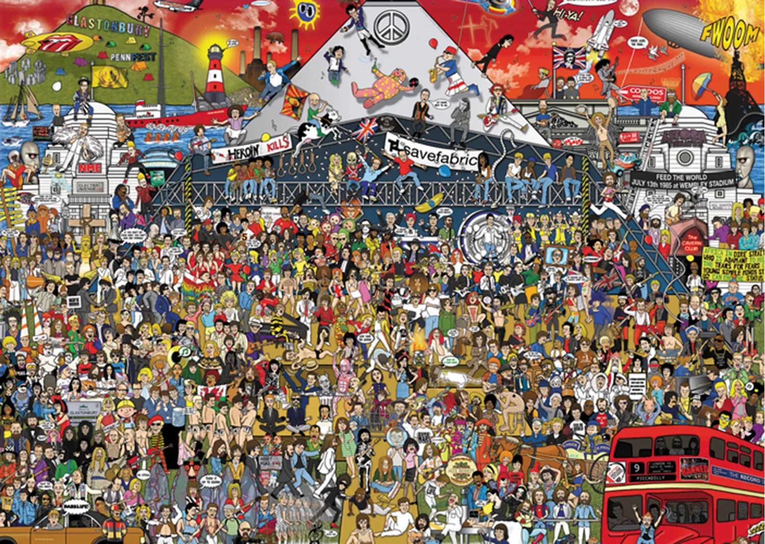 2000 Teile Meisterwimmler Alex Bennett hat sich diesmal daran gemacht, die Heroen der britischen Musikgeschichte (inkl. Irland) zu einem gigantischen Suchbild zu vereinen. Gelegte Grösse: 96.6x68.8 cm.