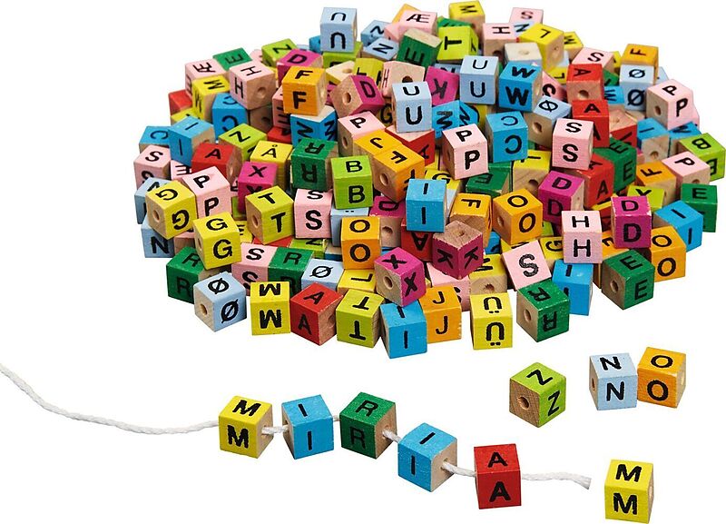 Bastel dir deine eigene Kette, ein Armband mit deinem Namen oder Namen deiner Freunde, indem du die einzelnen bunten Buchstabenwürfel auf einen Teil der Schnur auffädelst.